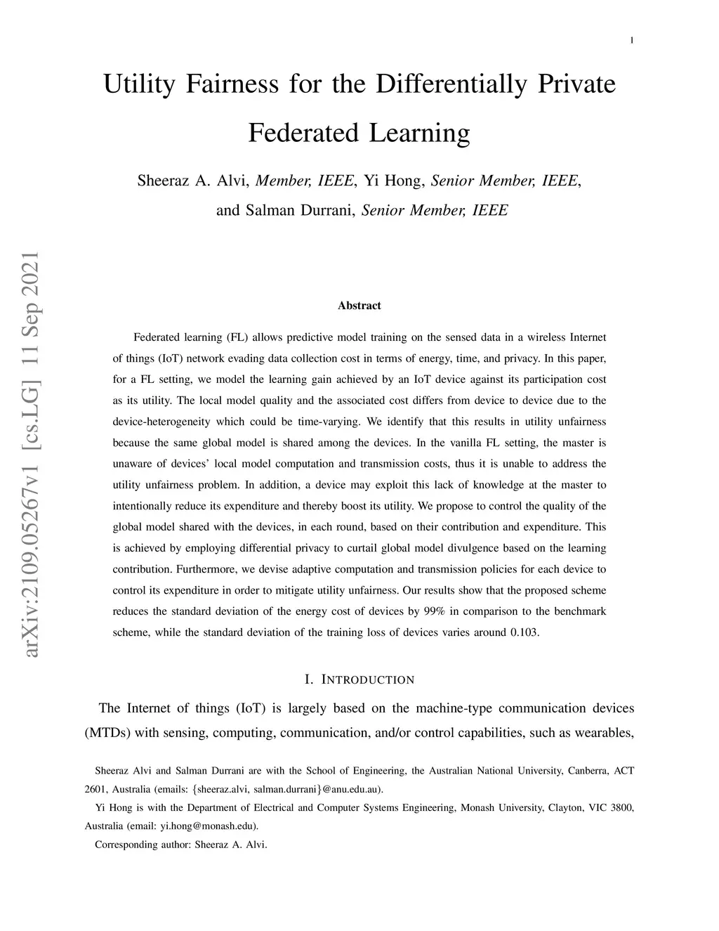 Federated learning (FL) allows predictive model training on the sensed data in a wireless Internet of things (IoT) network evading data collection cost in terms of energy, time, and privacy. In this paper, for a FL setting, we model the learning gain achieved by an IoT device against its participation cost as its utility. The local model quality and the associated cost differs from device to device due to the device-heterogeneity which could be time-varying. We identify that this results in utility unfairness because the same global model is shared among the devices. In the vanilla FL setting, the master is unaware of devices' local model computation and transmission costs, thus it is unable to address the utility unfairness problem. In addition, a device may exploit this lack of knowledge at the master to intentionally reduce its expenditure and thereby boost its utility. We propose to control the quality of the global model shared with the devices, in each round, based on their contribution and expenditure. This is achieved by employing differential privacy to curtail global model divulgence based on the learning contribution. Furthermore, we devise adaptive computation and transmission policies for each device to control its expenditure in order to mitigate utility unfairness. Our results show that the proposed scheme reduces the standard deviation of the energy cost of devices by 99% in comparison to the benchmark scheme, while the standard deviation of the training loss of devices varies around 0.103.