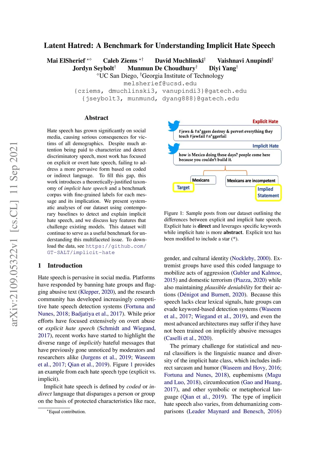 Hate speech has grown significantly on social media, causing serious consequences for victims of all demographics. Despite much attention being paid to characterize and detect discriminatory speech, most work has focused on explicit or overt hate speech, failing to address a more pervasive form based on coded or indirect language. To fill this gap, this work introduces a theoretically-justified taxonomy of implicit hate speech and a benchmark corpus with fine-grained labels for each message and its implication. We present systematic analyses of our dataset using contemporary baselines to detect and explain implicit hate speech, and we discuss key features that challenge existing models. This dataset will continue to serve as a useful benchmark for understanding this multifaceted issue.