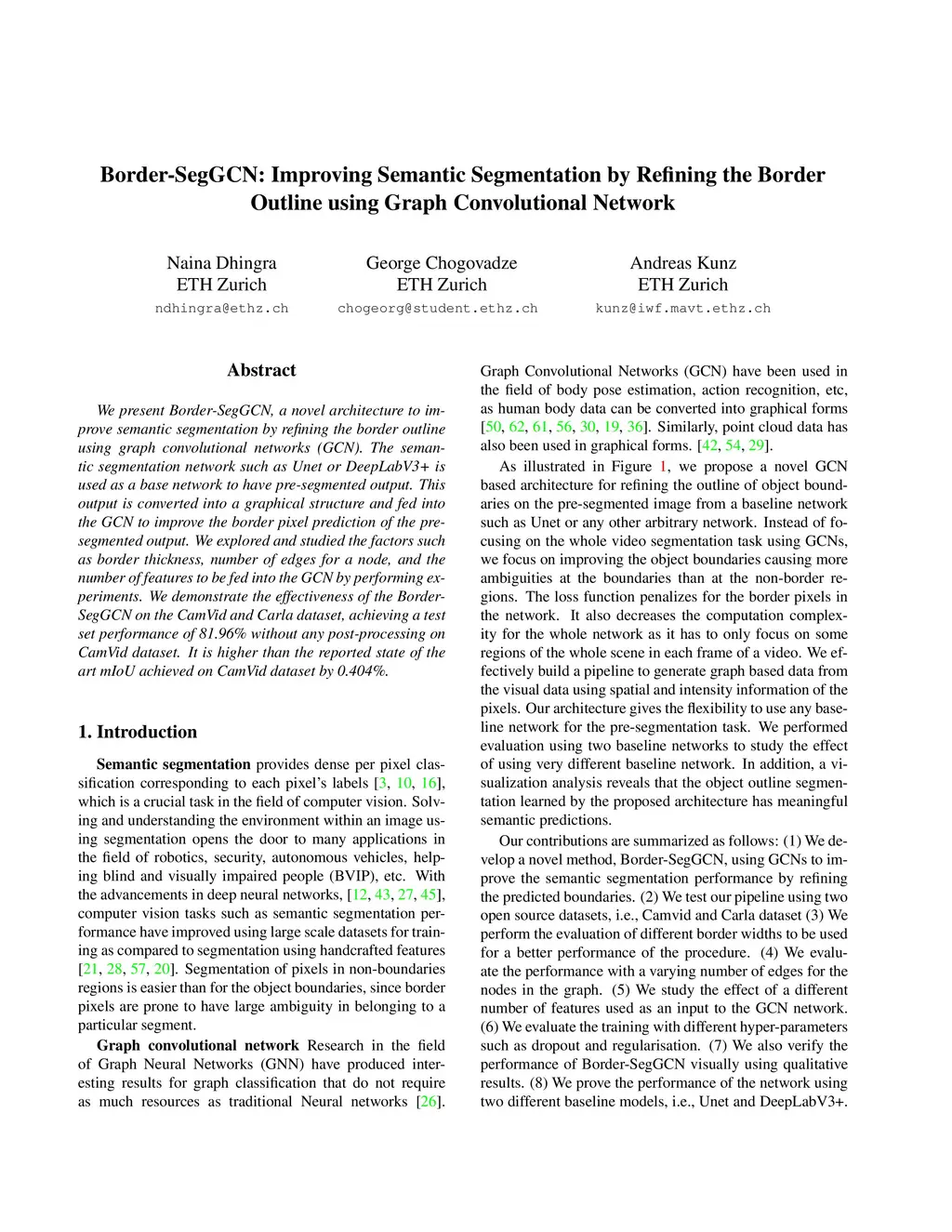 We present Border-SegGCN, a novel architecture to improve semantic segmentation by refining the border outline using graph convolutional networks (GCN). The semantic segmentation network such as Unet or DeepLabV3+ is used as a base network to have pre-segmented output. This output is converted into a graphical structure and fed into the GCN to improve the border pixel prediction of the pre-segmented output. We explored and studied the factors such as border thickness, number of edges for a node, and the number of features to be fed into the GCN by performing experiments. We demonstrate the effectiveness of the Border-SegGCN on the CamVid and Carla dataset, achieving a test set performance of 81.96% without any post-processing on CamVid dataset. It is higher than the reported state of the art mIoU achieved on CamVid dataset by 0.404%