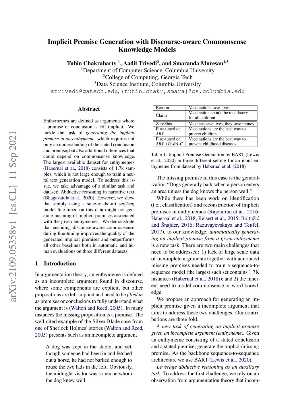 Enthymemes are defined as arguments where a premise or conclusion is left implicit. We tackle the task of generating the implicit premise in an enthymeme, which requires not only an understanding of the stated conclusion and premise but also additional inferences that could depend on commonsense knowledge. The largest available dataset for enthymemes (Habernal et al., 2018) consists of 1.7k samples, which is not large enough to train a neural text generation model. To address this issue, we take advantage of a similar task and dataset: Abductive reasoning in narrative text (Bhagavatula et al., 2020). However, we show that simply using a state-of-the-art seq2seq model fine-tuned on this data might not generate meaningful implicit premises associated with the given enthymemes. We demonstrate that encoding discourse-aware commonsense during fine-tuning improves the quality of the generated implicit premises and outperforms all other baselines both in automatic and human evaluations on three different datasets.
