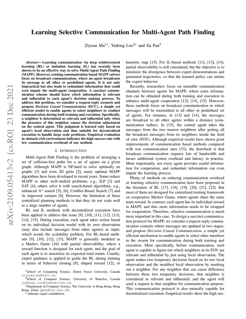 Learning communication via deep reinforcement learning (RL) or imitation learning (IL) has recently been shown to be an effective way to solve Multi-Agent Path Finding (MAPF). However, existing communication based MAPF solvers focus on broadcast communication, where an agent broadcasts its message to all other or predefined agents. It is not only impractical but also leads to redundant information that could even impair the multi-agent cooperation. A succinct communication scheme should learn which information is relevant and influential to each agent's decision making process. To address this problem, we consider a request-reply scenario and propose Decision Causal Communication (DCC), a simple yet efficient model to enable agents to select neighbors to conduct communication during both training and execution. Specifically, a neighbor is determined as relevant and influential only when the presence of this neighbor causes the decision adjustment on the central agent. This judgment is learned only based on agent's local observation and thus suitable for decentralized execution to handle large scale problems. Empirical evaluation in obstacle-rich environment indicates the high success rate with low communication overhead of our method.