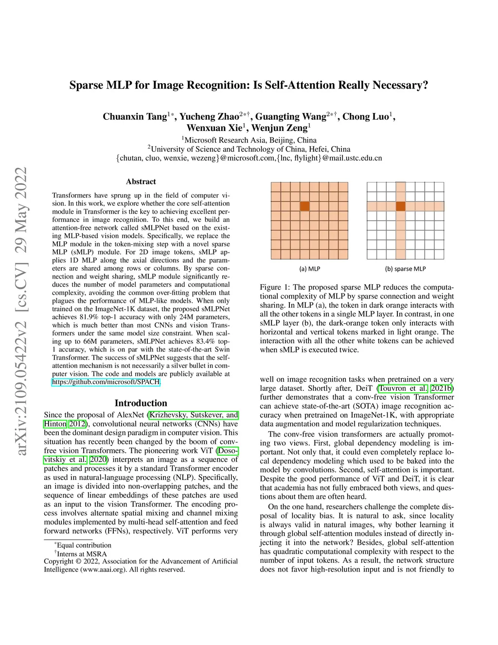Transformers have sprung up in the field of computer vision. In this work, we explore whether the core self-attention module in Transformer is the key to achieving excellent performance in image recognition. To this end, we build an attention-free network called sMLPNet based on the existing MLP-based vision models. Specifically, we replace the MLP module in the token-mixing step with a novel sparse MLP (sMLP) module. For 2D image tokens, sMLP applies 1D MLP along the axial directions and the parameters are shared among rows or columns. By sparse connection and weight sharing, sMLP module significantly reduces the number of model parameters and computational complexity, avoiding the common over-fitting problem that plagues the performance of MLP-like models. When only trained on the ImageNet-1K dataset, the proposed sMLPNet achieves 81.9% top-1 accuracy with only 24M parameters, which is much better than most CNNs and vision Transformers under the same model size constraint. When scaling up to 66M parameters, sMLPNet achieves 83.4% top-1 accuracy, which is on par with the state-of-the-art Swin Transformer. The success of sMLPNet suggests that the self-attention mechanism is not necessarily a silver bullet in computer vision. The code and models are publicly available at https://github.com/microsoft/SPACH