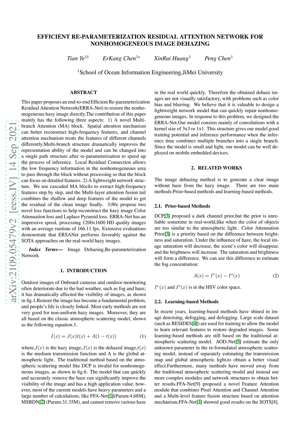 This paper proposes an end-to-end Efficient Re-parameterizationResidual Attention Network(ERRA-Net) to directly restore the nonhomogeneous hazy image. The contribution of this paper mainly has the following three aspects: 1) A novel Multi-branch Attention (MA) block. The spatial attention mechanism better reconstructs high-frequency features, and the channel attention mechanism treats the features of different channels differently. Multi-branch structure dramatically improves the representation ability of the model and can be changed into a single path structure after re-parameterization to speed up the process of inference. Local Residual Connection allows the low-frequency information in the nonhomogeneous area to pass through the block without processing so that the block can focus on detailed features. 2) A lightweight network structure. We use cascaded MA blocks to extract high-frequency features step by step, and the Multi-layer attention fusion tail combines the shallow and deep features of the model to get the residual of the clean image finally. 3)We propose two novel loss functions to help reconstruct the hazy image ColorAttenuation loss and Laplace Pyramid loss. ERRA-Net has an impressive speed, processing 1200x1600 HD quality images with an average runtime of 166.11 fps. Extensive evaluations demonstrate that ERSANet performs favorably against the SOTA approaches on the real-world hazy images.