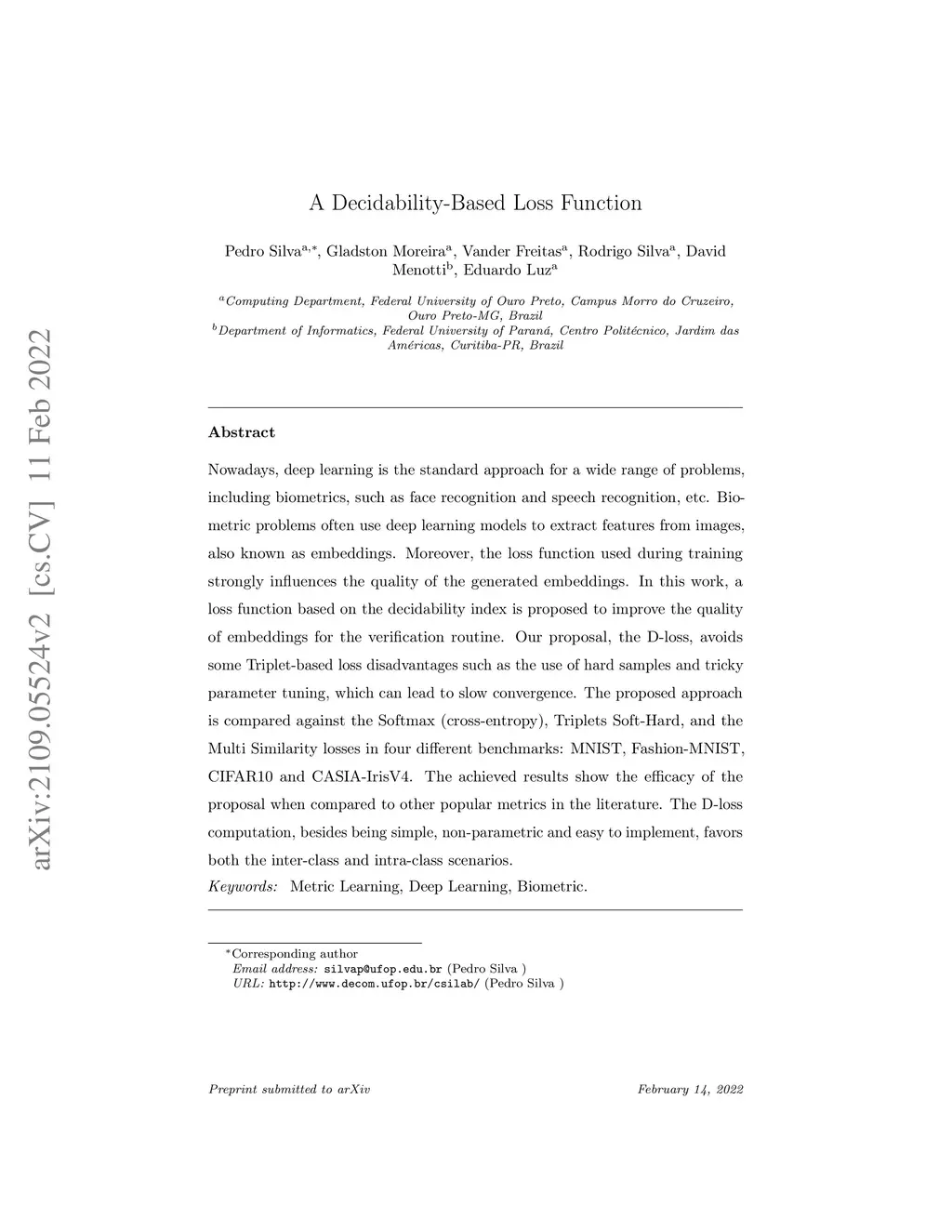 Nowadays, deep learning is the standard approach for a wide range of problems, including biometrics, such as face recognition and speech recognition, etc. Biometric problems often use deep learning models to extract features from images, also known as embeddings. Moreover, the loss function used during training strongly influences the quality of the generated embeddings. In this work, a loss function based on the decidability index is proposed to improve the quality of embeddings for the verification routine. Our proposal, the D-loss, avoids some Triplet-based loss disadvantages such as the use of hard samples and tricky parameter tuning, which can lead to slow convergence. The proposed approach is compared against the Softmax (cross-entropy), Triplets Soft-Hard, and the Multi Similarity losses in four different benchmarks: MNIST, Fashion-MNIST, CIFAR10 and CASIA-IrisV4. The achieved results show the efficacy of the proposal when compared to other popular metrics in the literature. The D-loss computation, besides being simple, non-parametric and easy to implement, favors both the inter-class and intra-class scenarios.