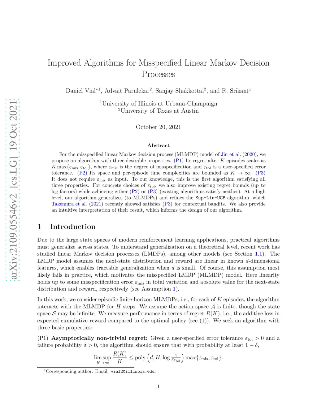 For the misspecified linear Markov decision process (MLMDP) model of Jin et al. [2020], we propose an algorithm with three desirable properties. (P1) Its regret after episodes scales as , where is the degree of misspecification and is a user-specified error tolerance. (P2) Its space and per-episode time complexities remain bounded as . (P3) It does not require as input. To our knowledge, this is the first algorithm satisfying all three properties. For concrete choices of , we also improve existing regret bounds (up to log factors) while achieving either (P2) or (P3) (existing algorithms satisfy neither). At a high level, our algorithm generalizes (to MLMDPs) and refines the Sup-Lin-UCB algorithm, which Takemura et al. [2021] recently showed satisfies (P3) for contextual bandits. We also provide an intuitive interpretation of their result, which informs the design of our algorithm.
