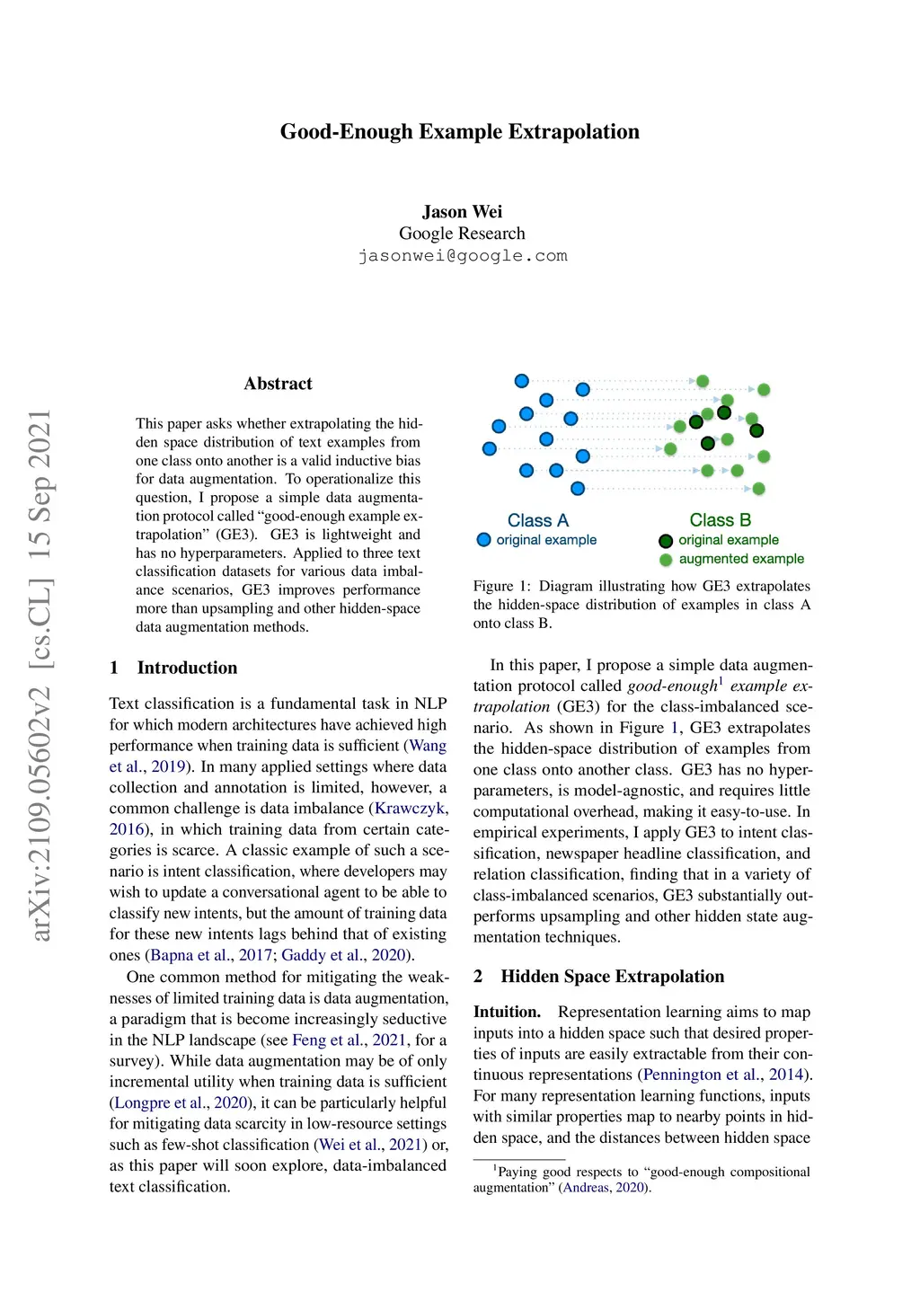 This paper asks whether extrapolating the hidden space distribution of text examples from one class onto another is a valid inductive bias for data augmentation. To operationalize this question, I propose a simple data augmentation protocol called "good-enough example extrapolation" (GE3). GE3 is lightweight and has no hyperparameters. Applied to three text classification datasets for various data imbalance scenarios, GE3 improves performance more than upsampling and other hidden-space data augmentation methods.