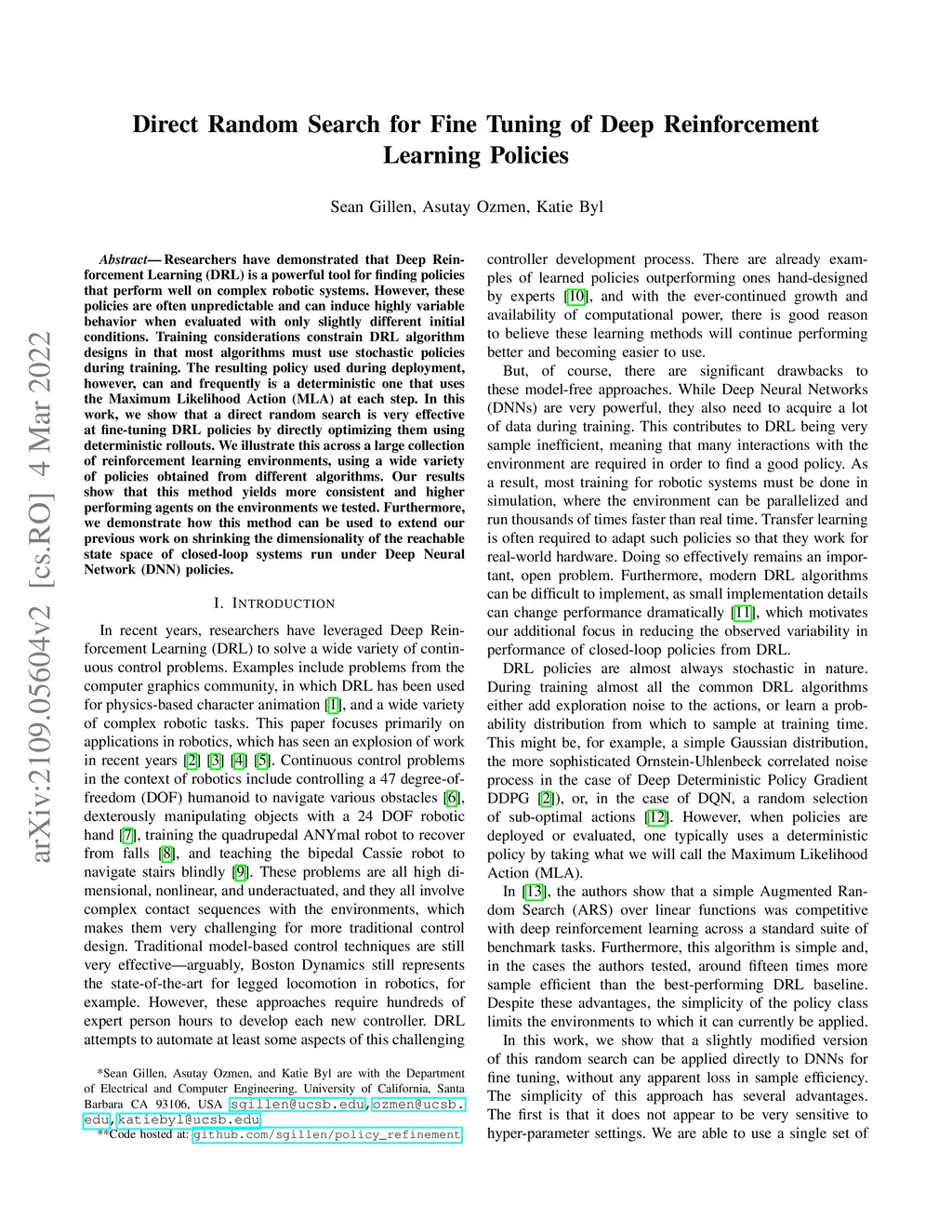 Direct Random Search for Fine Tuning of Deep Reinforcement Learning