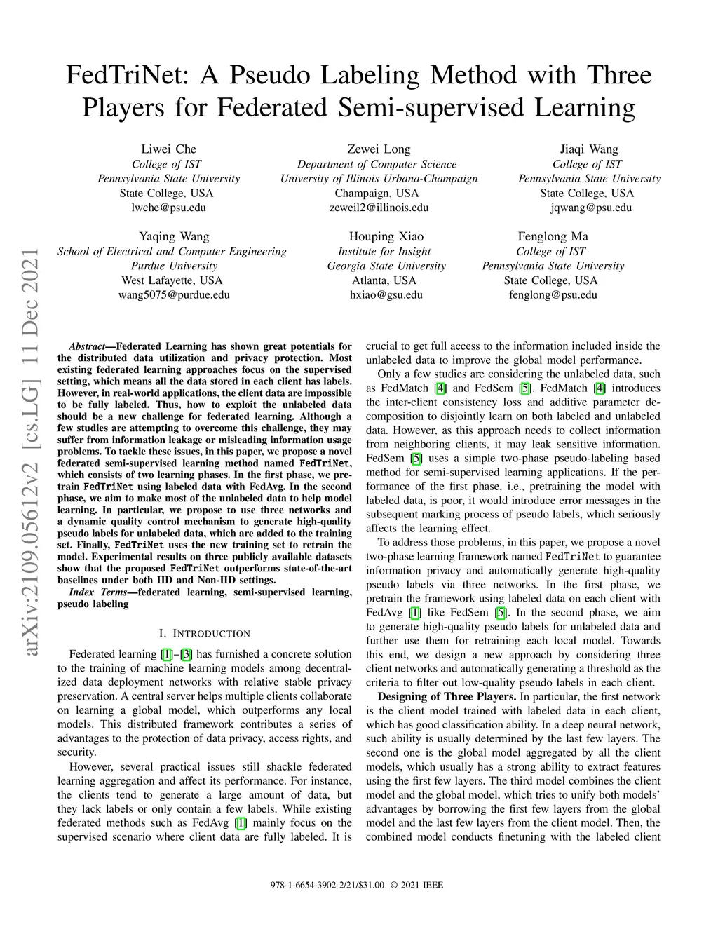 FedTriNet: A Pseudo Labeling Method with Three Players for Federated