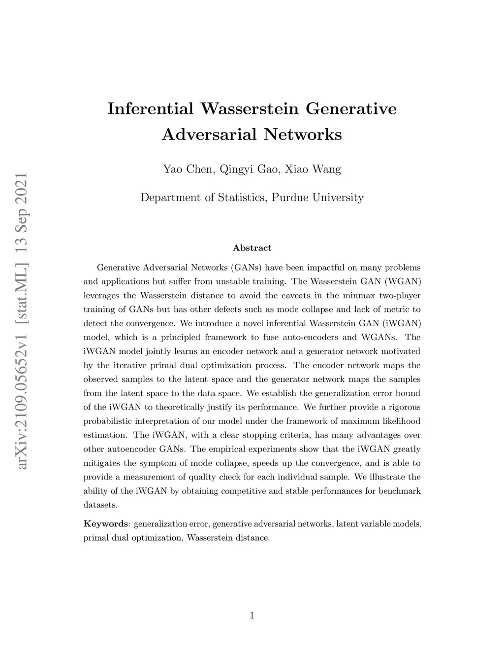 Generative Adversarial Networks (GANs) have been impactful on many problems and applications but suffer from unstable training. The Wasserstein GAN (WGAN) leverages the Wasserstein distance to avoid the caveats in the minmax two-player training of GANs but has other defects such as mode collapse and lack of metric to detect the convergence. We introduce a novel inferential Wasserstein GAN (iWGAN) model, which is a principled framework to fuse auto-encoders and WGANs. The iWGAN model jointly learns an encoder network and a generator network motivated by the iterative primal dual optimization process. The encoder network maps the observed samples to the latent space and the generator network maps the samples from the latent space to the data space. We establish the generalization error bound of the iWGAN to theoretically justify its performance. We further provide a rigorous probabilistic interpretation of our model under the framework of maximum likelihood estimation. The iWGAN, with a clear stopping criteria, has many advantages over other autoencoder GANs. The empirical experiments show that the iWGAN greatly mitigates the symptom of mode collapse, speeds up the convergence, and is able to provide a measurement of quality check for each individual sample. We illustrate the ability of the iWGAN by obtaining competitive and stable performances for benchmark datasets.