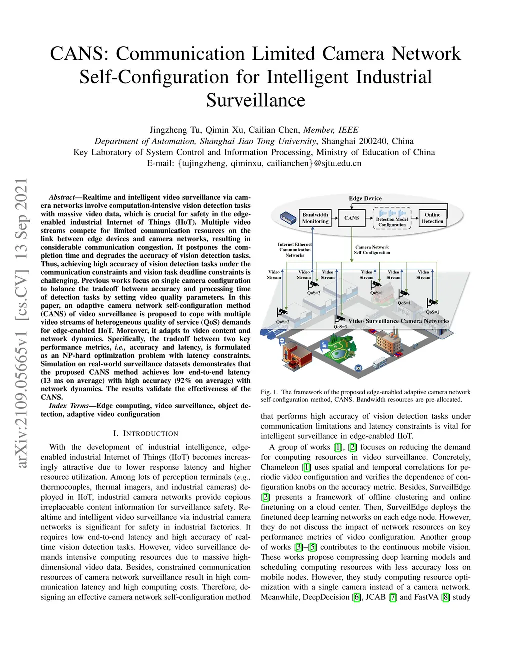 Realtime and intelligent video surveillance via camera networks involve computation-intensive vision detection tasks with massive video data, which is crucial for safety in the edge-enabled industrial Internet of Things (IIoT). Multiple video streams compete for limited communication resources on the link between edge devices and camera networks, resulting in considerable communication congestion. It postpones the completion time and degrades the accuracy of vision detection tasks. Thus, achieving high accuracy of vision detection tasks under the communication constraints and vision task deadline constraints is challenging. Previous works focus on single camera configuration to balance the tradeoff between accuracy and processing time of detection tasks by setting video quality parameters. In this paper, an adaptive camera network self-configuration method (CANS) of video surveillance is proposed to cope with multiple video streams of heterogeneous quality of service (QoS) demands for edge-enabled IIoT. Moreover, it adapts to video content and network dynamics. Specifically, the tradeoff between two key performance metrics, \emph{i.e.,} accuracy and latency, is formulated as an NP-hard optimization problem with latency constraints. Simulation on real-world surveillance datasets demonstrates that the proposed CANS method achieves low end-to-end latency (13 ms on average) with high accuracy (92\% on average) with network dynamics. The results validate the effectiveness of the CANS.