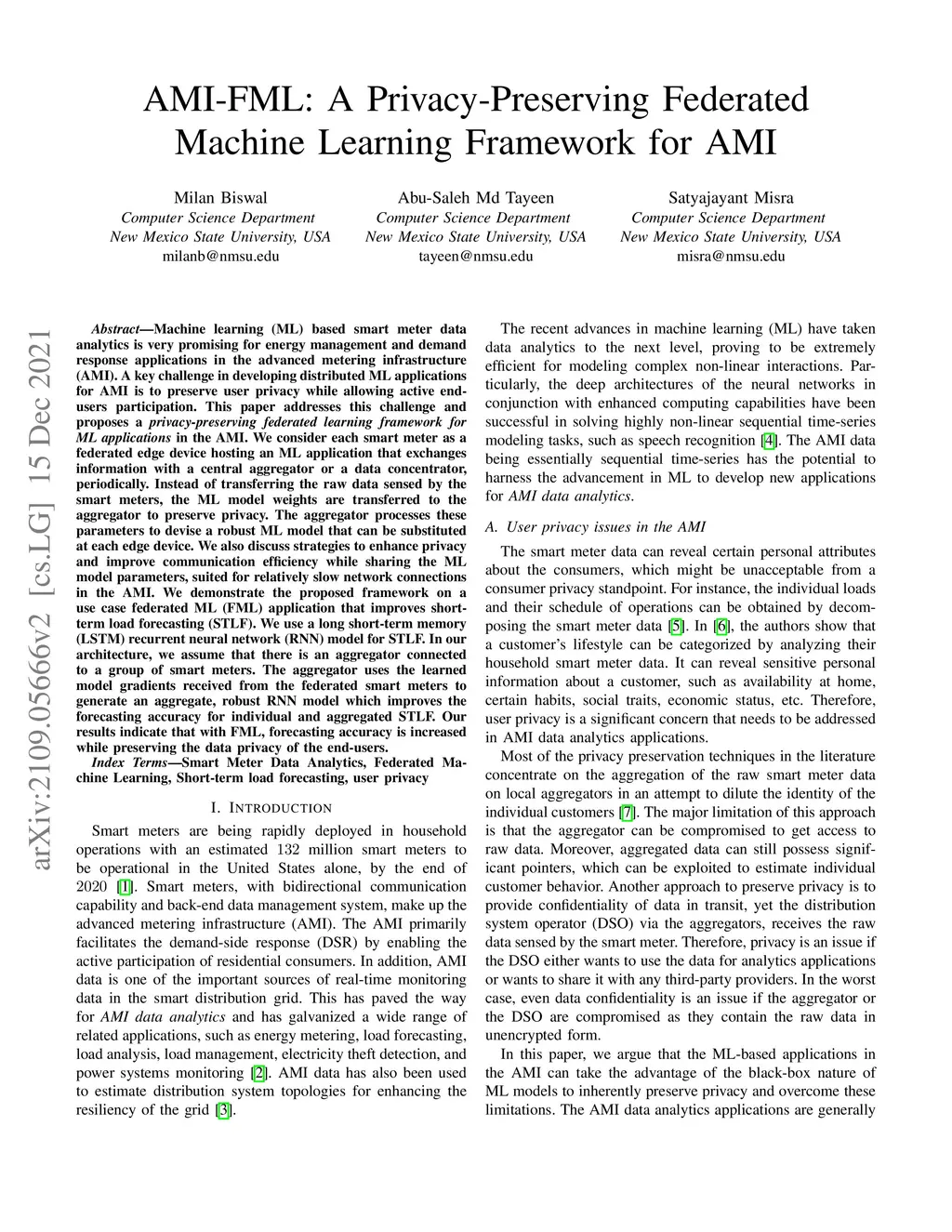 Machine learning (ML) based smart meter data analytics is very promising for energy management and demand-response applications in the advanced metering infrastructure(AMI). A key challenge in developing distributed ML applications for AMI is to preserve user privacy while allowing active end-users participation. This paper addresses this challenge and proposes a privacy-preserving federated learning framework for ML applications in the AMI. We consider each smart meter as a federated edge device hosting an ML application that exchanges information with a central aggregator or a data concentrator, periodically. Instead of transferring the raw data sensed by the smart meters, the ML model weights are transferred to the aggregator to preserve privacy. The aggregator processes these parameters to devise a robust ML model that can be substituted at each edge device. We also discuss strategies to enhance privacy and improve communication efficiency while sharing the ML model parameters, suited for relatively slow network connections in the AMI. We demonstrate the proposed framework on a use case federated ML (FML) application that improves short-term load forecasting (STLF). We use a long short-term memory(LSTM) recurrent neural network (RNN) model for STLF. In our architecture, we assume that there is an aggregator connected to a group of smart meters. The aggregator uses the learned model gradients received from the federated smart meters to generate an aggregate, robust RNN model which improves the forecasting accuracy for individual and aggregated STLF. Our results indicate that with FML, forecasting accuracy is increased while preserving the data privacy of the end-users.