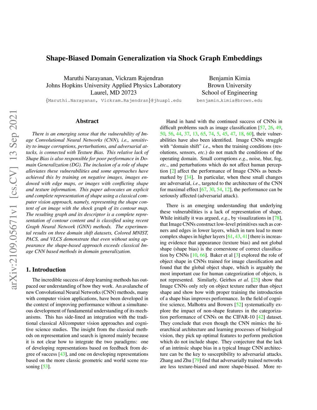 There is an emerging sense that the vulnerability of Image Convolutional Neural Networks (CNN), i.e., sensitivity to image corruptions, perturbations, and adversarial attacks, is connected with Texture Bias. This relative lack of Shape Bias is also responsible for poor performance in Domain Generalization (DG). The inclusion of a role of shape alleviates these vulnerabilities and some approaches have achieved this by training on negative images, images endowed with edge maps, or images with conflicting shape and texture information. This paper advocates an explicit and complete representation of shape using a classical computer vision approach, namely, representing the shape content of an image with the shock graph of its contour map. The resulting graph and its descriptor is a complete representation of contour content and is classified using recent Graph Neural Network (GNN) methods. The experimental results on three domain shift datasets, Colored MNIST, PACS, and VLCS demonstrate that even without using appearance the shape-based approach exceeds classical Image CNN based methods in domain generalization.