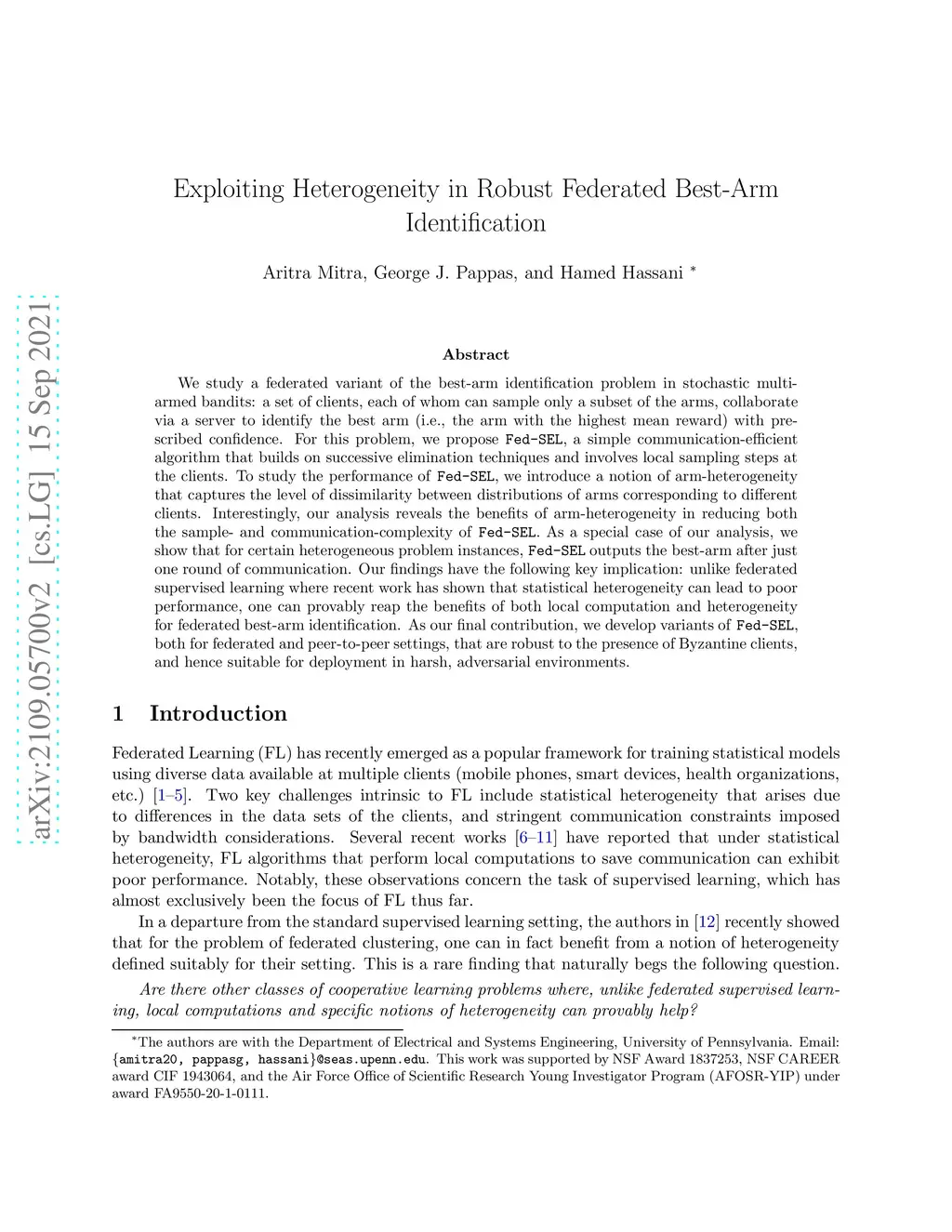 We study a federated variant of the best-arm identification problem in stochastic multi-armed bandits: a set of clients, each of whom can sample only a subset of the arms, collaborate via a server to identify the best arm (i.e., the arm with the highest mean reward) with prescribed confidence. For this problem, we propose Fed-SEL, a simple communication-efficient algorithm that builds on successive elimination techniques and involves local sampling steps at the clients. To study the performance of Fed-SEL, we introduce a notion of arm-heterogeneity that captures the level of dissimilarity between distributions of arms corresponding to different clients. Interestingly, our analysis reveals the benefits of arm-heterogeneity in reducing both the sample- and communication-complexity of Fed-SEL. As a special case of our analysis, we show that for certain heterogeneous problem instances, Fed-SEL outputs the best-arm after just one round of communication. Our findings have the following key implication: unlike federated supervised learning where recent work has shown that statistical heterogeneity can lead to poor performance, one can provably reap the benefits of both local computation and heterogeneity for federated best-arm identification. As our final contribution, we develop variants of Fed-SEL, both for federated and peer-to-peer settings, that are robust to the presence of Byzantine clients, and hence suitable for deployment in harsh, adversarial environments.