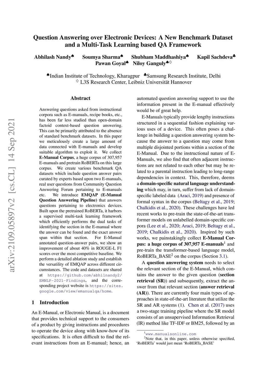 Answering questions asked from instructional corpora such as E-manuals, recipe books, etc., has been far less studied than open-domain factoid context-based question answering. This can be primarily attributed to the absence of standard benchmark datasets. In this paper we meticulously create a large amount of data connected with E-manuals and develop suitable algorithm to exploit it. We collect E-Manual Corpus, a huge corpus of 307,957 E-manuals and pretrain RoBERTa on this large corpus. We create various benchmark QA datasets which include question answer pairs curated by experts based upon two E-manuals, real user questions from Community Question Answering Forum pertaining to E-manuals etc. We introduce EMQAP (E-Manual Question Answering Pipeline) that answers questions pertaining to electronics devices. Built upon the pretrained RoBERTa, it harbors a supervised multi-task learning framework which efficiently performs the dual tasks of identifying the section in the E-manual where the answer can be found and the exact answer span within that section. For E-Manual annotated question-answer pairs, we show an improvement of about 40% in ROUGE-L F1 scores over the most competitive baseline. We perform a detailed ablation study and establish the versatility of EMQAP across different circumstances. The code and datasets are shared at https://github.com/abhi1nandy2/EMNLP-2021-Findings, and the corresponding project website is https://sites.google.com/view/emanualqa/home.
