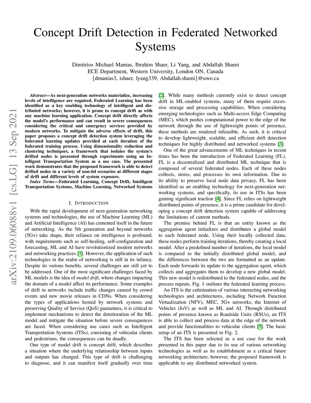 As next-generation networks materialize, increasing levels of intelligence are required. Federated Learning has been identified as a key enabling technology of intelligent and distributed networks; however, it is prone to concept drift as with any machine learning application. Concept drift directly affects the model's performance and can result in severe consequences considering the critical and emergency services provided by modern networks. To mitigate the adverse effects of drift, this paper proposes a concept drift detection system leveraging the federated learning updates provided at each iteration of the federated training process. Using dimensionality reduction and clustering techniques, a framework that isolates the system's drifted nodes is presented through experiments using an Intelligent Transportation System as a use case. The presented work demonstrates that the proposed framework is able to detect drifted nodes in a variety of non-iid scenarios at different stages of drift and different levels of system exposure.