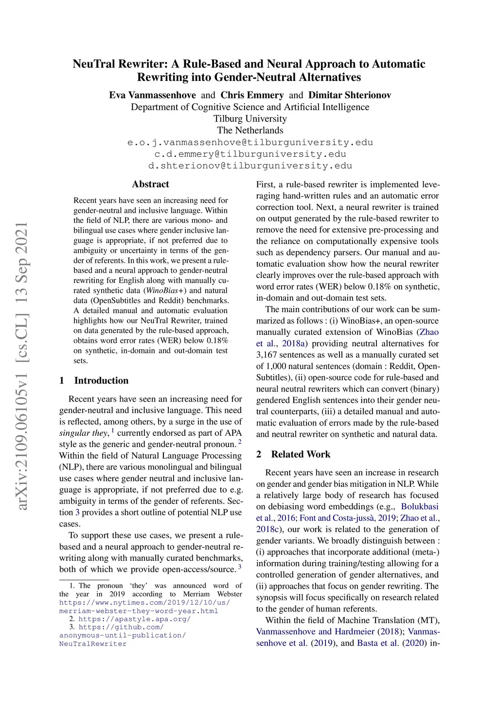 Recent years have seen an increasing need for gender-neutral and inclusive language. Within the field of NLP, there are various mono- and bilingual use cases where gender inclusive language is appropriate, if not preferred due to ambiguity or uncertainty in terms of the gender of referents. In this work, we present a rule-based and a neural approach to gender-neutral rewriting for English along with manually curated synthetic data (WinoBias+) and natural data (OpenSubtitles and Reddit) benchmarks. A detailed manual and automatic evaluation highlights how our NeuTral Rewriter, trained on data generated by the rule-based approach, obtains word error rates (WER) below 0.18% on synthetic, in-domain and out-domain test sets.
