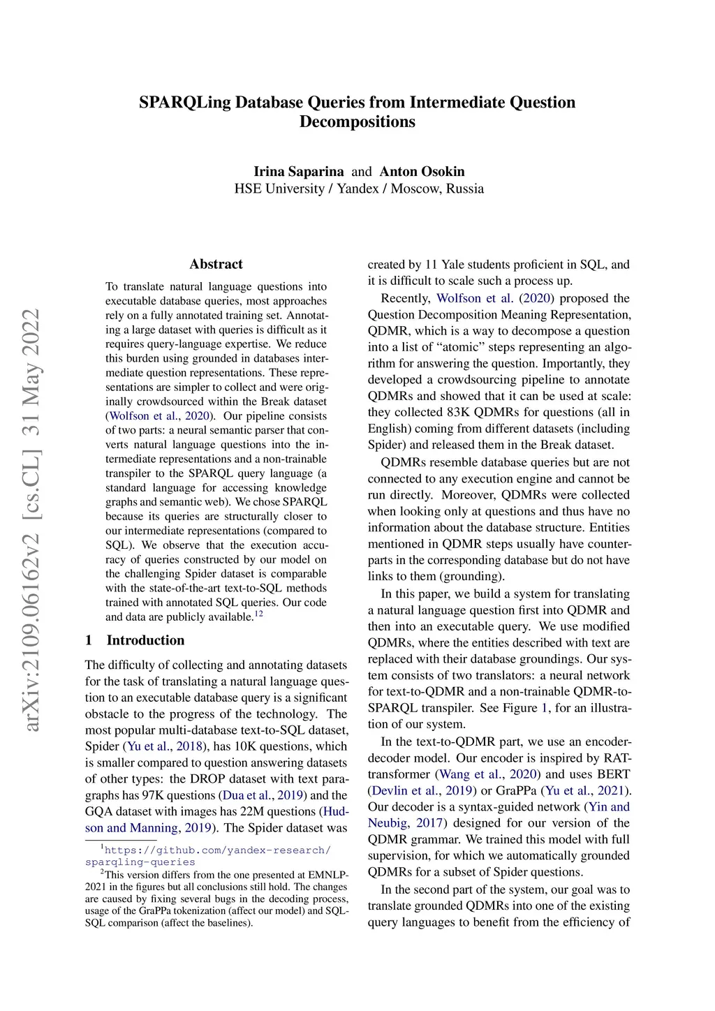 To translate natural language questions into executable database queries, most approaches rely on a fully annotated training set. Annotating a large dataset with queries is difficult as it requires query-language expertise. We reduce this burden using grounded in databases intermediate question representations. These representations are simpler to collect and were originally crowdsourced within the Break dataset (Wolfson et al., 2020). Our pipeline consists of two parts: a neural semantic parser that converts natural language questions into the intermediate representations and a non-trainable transpiler to the SPARQL query language (a standard language for accessing knowledge graphs and semantic web). We chose SPARQL because its queries are structurally closer to our intermediate representations (compared to SQL). We observe that the execution accuracy of queries constructed by our model on the challenging Spider dataset is comparable with the state-of-the-art text-to-SQL methods trained with annotated SQL queries. Our code and data are publicly available (see https://github.com/yandex-research/sparqling-queries).