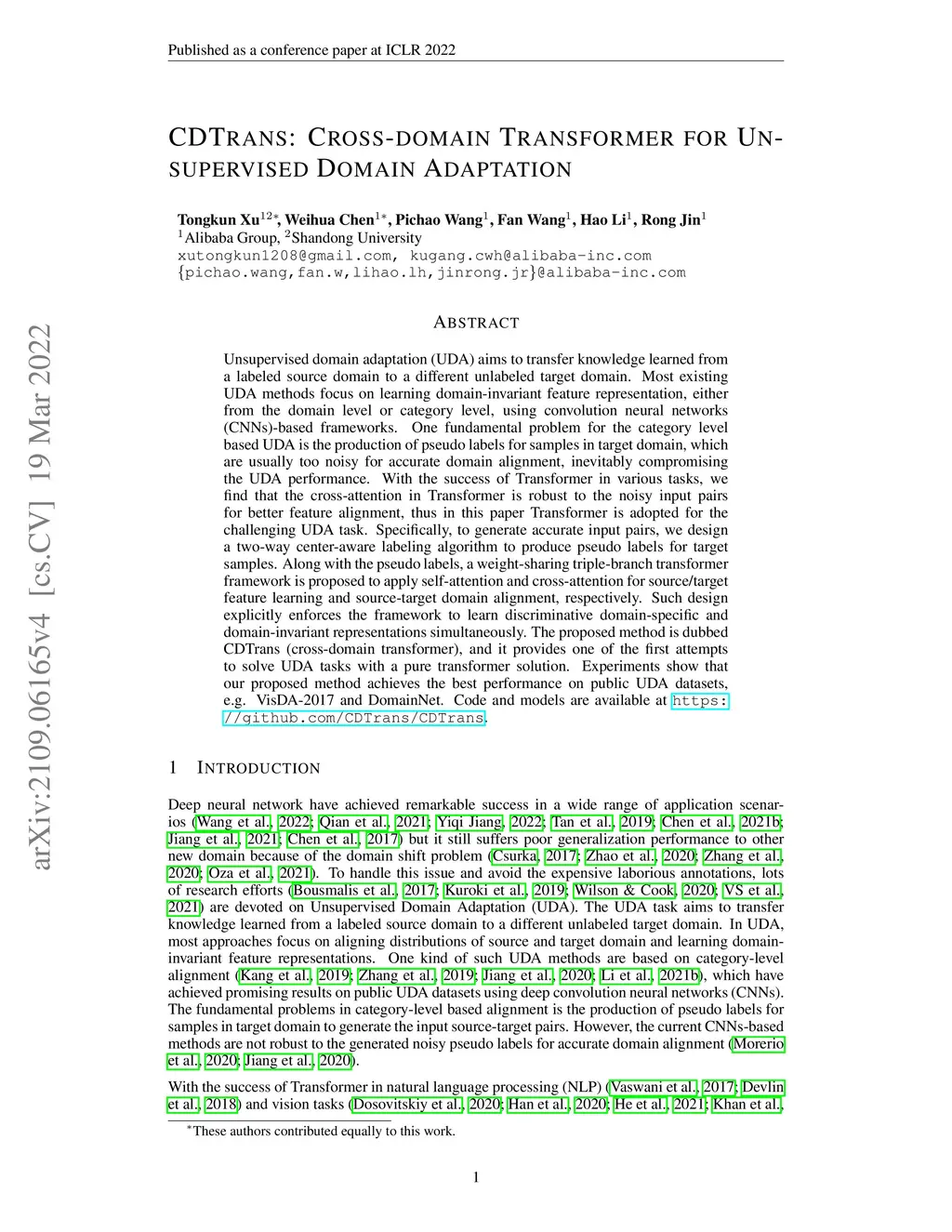 Unsupervised domain adaptation (UDA) aims to transfer knowledge learned from a labeled source domain to a different unlabeled target domain. Most existing UDA methods focus on learning domain-invariant feature representation, either from the domain level or category level, using convolution neural networks (CNNs)-based frameworks. One fundamental problem for the category level based UDA is the production of pseudo labels for samples in target domain, which are usually too noisy for accurate domain alignment, inevitably compromising the UDA performance. With the success of Transformer in various tasks, we find that the cross-attention in Transformer is robust to the noisy input pairs for better feature alignment, thus in this paper Transformer is adopted for the challenging UDA task. Specifically, to generate accurate input pairs, we design a two-way center-aware labeling algorithm to produce pseudo labels for target samples. Along with the pseudo labels, a weight-sharing triple-branch transformer framework is proposed to apply self-attention and cross-attention for source/target feature learning and source-target domain alignment, respectively. Such design explicitly enforces the framework to learn discriminative domain-specific and domain-invariant representations simultaneously. The proposed method is dubbed CDTrans (cross-domain transformer), and it provides one of the first attempts to solve UDA tasks with a pure transformer solution. Experiments show that our proposed method achieves the best performance on public UDA datasets, e.g. VisDA-2017 and DomainNet. Code and models are available at https://github.com/CDTrans/CDTrans.