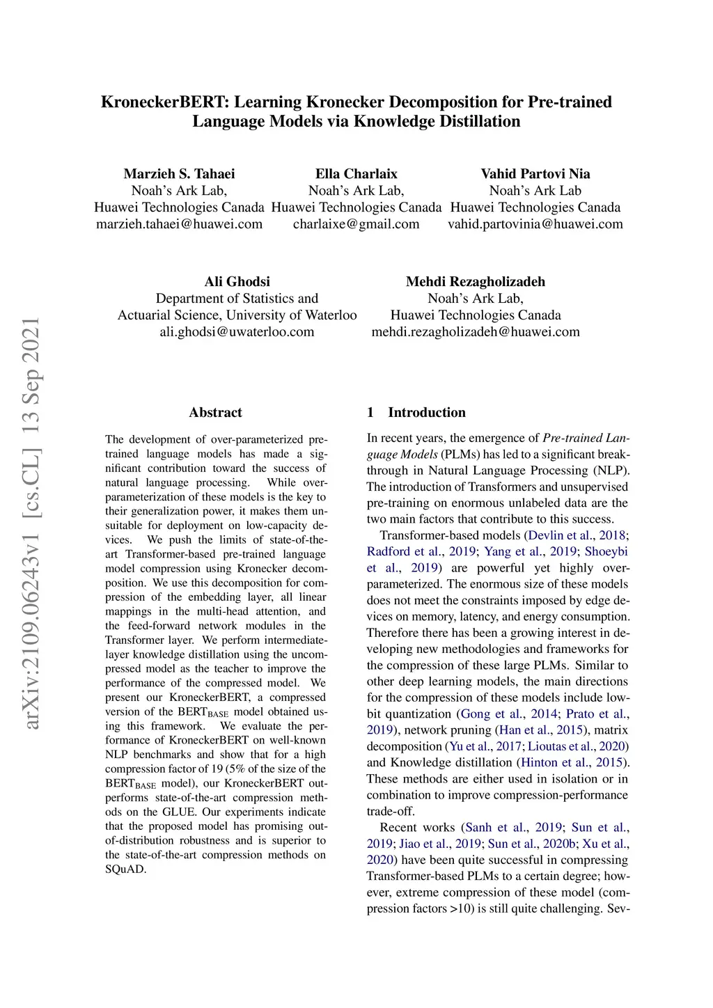 KroneckerBERT: Learning Kronecker Decomposition for Pre-trained Language
