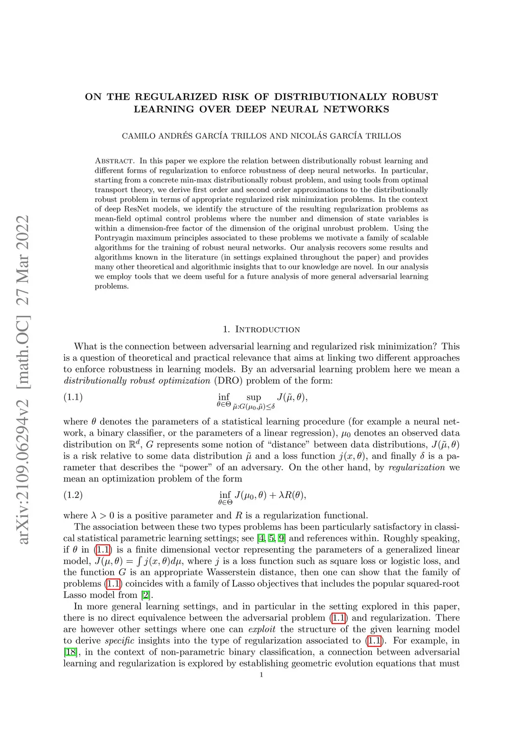 In this paper we explore the relation between distributionally robust learning and different forms of regularization to enforce robustness of deep neural networks. In particular, starting from a concrete min-max distributionally robust problem, and using tools from optimal transport theory, we derive first order and second order approximations to the distributionally robust problem in terms of appropriate regularized risk minimization problems. In the context of deep ResNet models, we identify the structure of the resulting regularization problems as mean-field optimal control problems where the number and dimension of state variables is within a dimension-free factor of the dimension of the original unrobust problem. Using the Pontryagin maximum principles associated to these problems we motivate a family of scalable algorithms for the training of robust neural networks. Our analysis recovers some results and algorithms known in the literature (in settings explained throughout the paper) and provides many other theoretical and algorithmic insights that to our knowledge are novel. In our analysis we employ tools that we deem useful for a future analysis of more general adversarial learning problems.