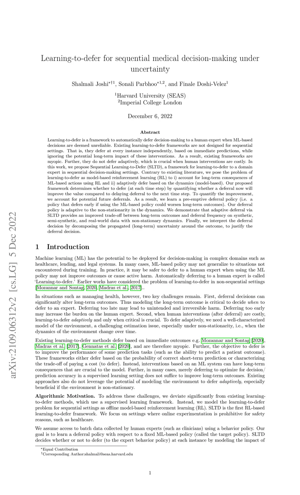 Learning-to-defer is a framework to automatically defer decision-making to a human expert when ML-based decisions are deemed unreliable. Existing learning-to-defer frameworks are not designed for sequential settings. That is, they defer at every instance independently, based on immediate predictions, while ignoring the potential long-term impact of these interventions. As a result, existing frameworks are myopic. Further, they do not defer adaptively, which is crucial when human interventions are costly. In this work, we propose Sequential Learning-to-Defer (SLTD), a framework for learning-to-defer to a domain expert in sequential decision-making settings. Contrary to existing literature, we pose the problem of learning-to-defer as model-based reinforcement learning (RL) to i) account for long-term consequences of ML-based actions using RL and ii) adaptively defer based on the dynamics (model-based). Our proposed framework determines whether to defer (at each time step) by quantifying whether a deferral now will improve the value compared to delaying deferral to the next time step. To quantify the improvement, we account for potential future deferrals. As a result, we learn a pre-emptive deferral policy (i.e. a policy that defers early if using the ML-based policy could worsen long-term outcomes). Our deferral policy is adaptive to the non-stationarity in the dynamics. We demonstrate that adaptive deferral via SLTD provides an improved trade-off between long-term outcomes and deferral frequency on synthetic, semi-synthetic, and real-world data with non-stationary dynamics. Finally, we interpret the deferral decision by decomposing the propagated (long-term) uncertainty around the outcome, to justify the deferral decision.