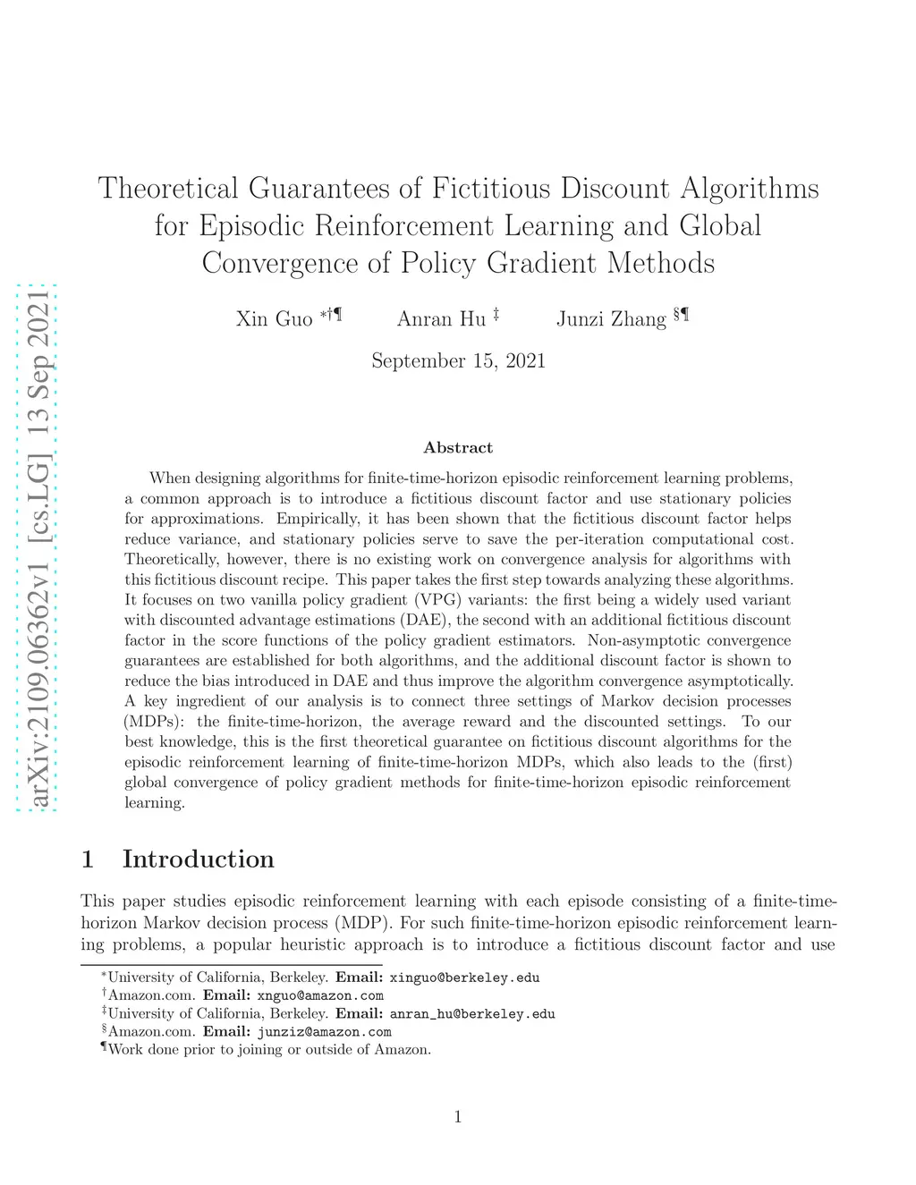 When designing algorithms for finite-time-horizon episodic reinforcement learning problems, a common approach is to introduce a fictitious discount factor and use stationary policies for approximations. Empirically, it has been shown that the fictitious discount factor helps reduce variance, and stationary policies serve to save the per-iteration computational cost. Theoretically, however, there is no existing work on convergence analysis for algorithms with this fictitious discount recipe. This paper takes the first step towards analyzing these algorithms. It focuses on two vanilla policy gradient (VPG) variants: the first being a widely used variant with discounted advantage estimations (DAE), the second with an additional fictitious discount factor in the score functions of the policy gradient estimators. Non-asymptotic convergence guarantees are established for both algorithms, and the additional discount factor is shown to reduce the bias introduced in DAE and thus improve the algorithm convergence asymptotically. A key ingredient of our analysis is to connect three settings of Markov decision processes (MDPs): the finite-time-horizon, the average reward and the discounted settings. To our best knowledge, this is the first theoretical guarantee on fictitious discount algorithms for the episodic reinforcement learning of finite-time-horizon MDPs, which also leads to the (first) global convergence of policy gradient methods for finite-time-horizon episodic reinforcement learning.