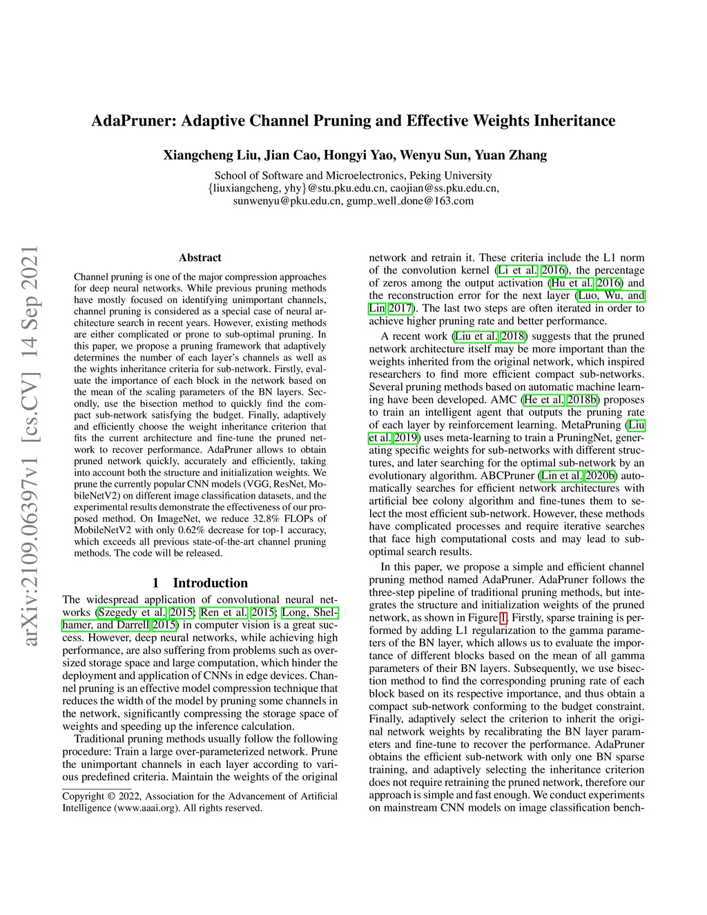 AdaPruner: Adaptive Channel Pruning and Effective Weights Inheritance