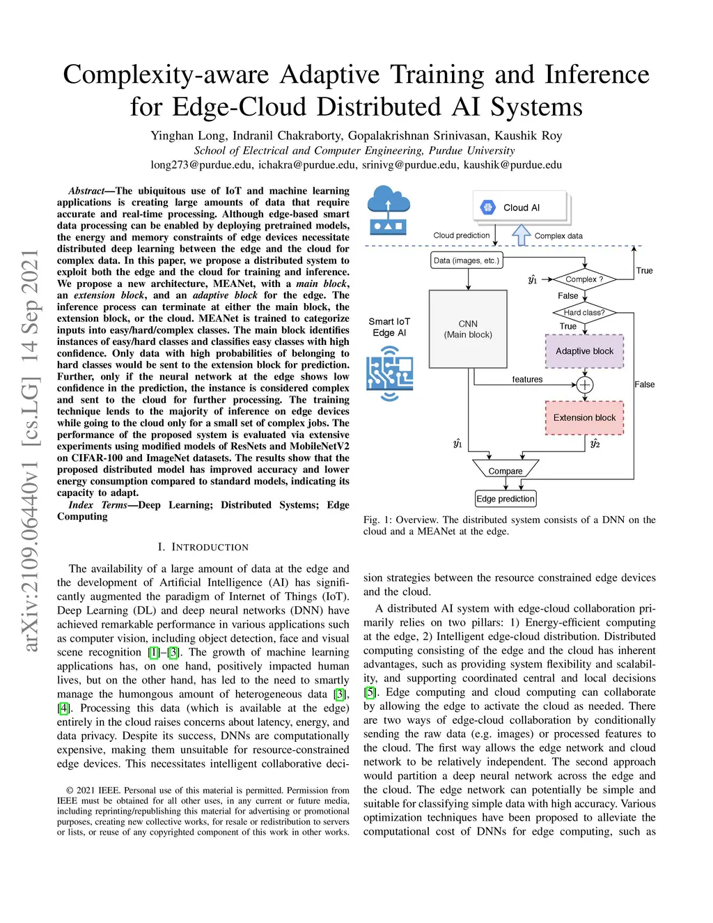 The ubiquitous use of IoT and machine learning applications is creating large amounts of data that require accurate and real-time processing. Although edge-based smart data processing can be enabled by deploying pretrained models, the energy and memory constraints of edge devices necessitate distributed deep learning between the edge and the cloud for complex data. In this paper, we propose a distributed AI system to exploit both the edge and the cloud for training and inference. We propose a new architecture, MEANet, with a main block, an extension block, and an adaptive block for the edge. The inference process can terminate at either the main block, the extension block, or the cloud. The MEANet is trained to categorize inputs into easy/hard/complex classes. The main block identifies instances of easy/hard classes and classifies easy classes with high confidence. Only data with high probabilities of belonging to hard classes would be sent to the extension block for prediction. Further, only if the neural network at the edge shows low confidence in the prediction, the instance is considered complex and sent to the cloud for further processing. The training technique lends to the majority of inference on edge devices while going to the cloud only for a small set of complex jobs, as determined by the edge. The performance of the proposed system is evaluated via extensive experiments using modified models of ResNets and MobileNetV2 on CIFAR-100 and ImageNet datasets. The results show that the proposed distributed model has improved accuracy and energy consumption, indicating its capacity to adapt.