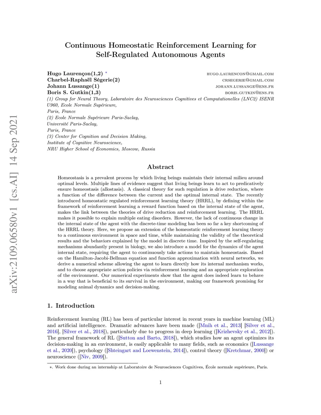 Homeostasis is a prevalent process by which living beings maintain their internal milieu around optimal levels. Multiple lines of evidence suggest that living beings learn to act to predicatively ensure homeostasis (allostasis). A classical theory for such regulation is drive reduction, where a function of the difference between the current and the optimal internal state. The recently introduced homeostatic regulated reinforcement learning theory (HRRL), by defining within the framework of reinforcement learning a reward function based on the internal state of the agent, makes the link between the theories of drive reduction and reinforcement learning. The HRRL makes it possible to explain multiple eating disorders. However, the lack of continuous change in the internal state of the agent with the discrete-time modeling has been so far a key shortcoming of the HRRL theory. Here, we propose an extension of the homeostatic reinforcement learning theory to a continuous environment in space and time, while maintaining the validity of the theoretical results and the behaviors explained by the model in discrete time. Inspired by the self-regulating mechanisms abundantly present in biology, we also introduce a model for the dynamics of the agent internal state, requiring the agent to continuously take actions to maintain homeostasis. Based on the Hamilton-Jacobi-Bellman equation and function approximation with neural networks, we derive a numerical scheme allowing the agent to learn directly how its internal mechanism works, and to choose appropriate action policies via reinforcement learning and an appropriate exploration of the environment. Our numerical experiments show that the agent does indeed learn to behave in a way that is beneficial to its survival in the environment, making our framework promising for modeling animal dynamics and decision-making.