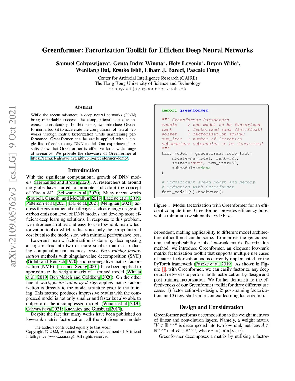 While the recent advances in deep neural networks (DNN) bring remarkable success, the computational cost also increases considerably. In this paper, we introduce Greenformer, a toolkit to accelerate the computation of neural networks through matrix factorization while maintaining performance. Greenformer can be easily applied with a single line of code to any DNN model. Our experimental results show that Greenformer is effective for a wide range of scenarios. We provide the showcase of Greenformer at https://samuelcahyawijaya.github.io/greenformer-demo/.