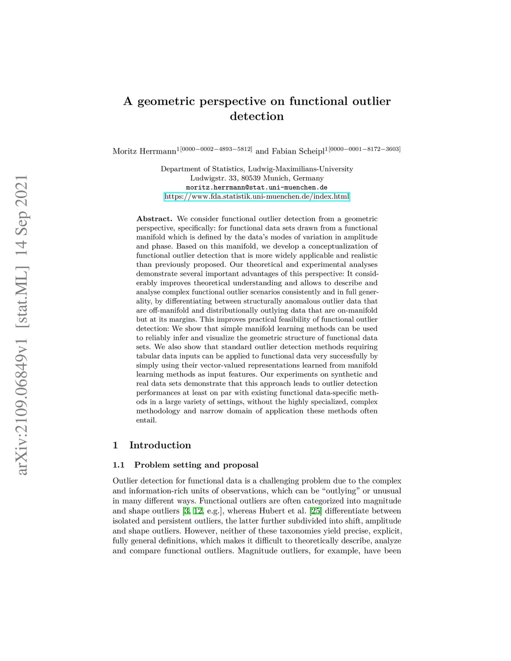 We consider functional outlier detection from a geometric perspective, specifically: for functional data sets drawn from a functional manifold which is defined by the data's modes of variation in amplitude and phase. Based on this manifold, we develop a conceptualization of functional outlier detection that is more widely applicable and realistic than previously proposed. Our theoretical and experimental analyses demonstrate several important advantages of this perspective: It considerably improves theoretical understanding and allows to describe and analyse complex functional outlier scenarios consistently and in full generality, by differentiating between structurally anomalous outlier data that are off-manifold and distributionally outlying data that are on-manifold but at its margins. This improves practical feasibility of functional outlier detection: We show that simple manifold learning methods can be used to reliably infer and visualize the geometric structure of functional data sets. We also show that standard outlier detection methods requiring tabular data inputs can be applied to functional data very successfully by simply using their vector-valued representations learned from manifold learning methods as input features. Our experiments on synthetic and real data sets demonstrate that this approach leads to outlier detection performances at least on par with existing functional data-specific methods in a large variety of settings, without the highly specialized, complex methodology and narrow domain of application these methods often entail.