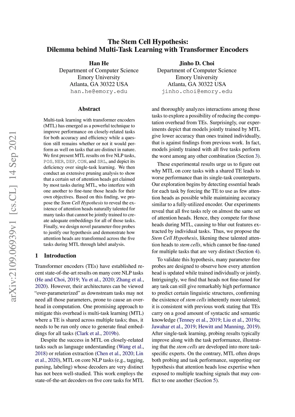 Multi-task learning with transformer encoders (MTL) has emerged as a powerful technique to improve performance on closely-related tasks for both accuracy and efficiency while a question still remains whether or not it would perform as well on tasks that are distinct in nature. We first present MTL results on five NLP tasks, POS, NER, DEP, CON, and SRL, and depict its deficiency over single-task learning. We then conduct an extensive pruning analysis to show that a certain set of attention heads get claimed by most tasks during MTL, who interfere with one another to fine-tune those heads for their own objectives. Based on this finding, we propose the Stem Cell Hypothesis to reveal the existence of attention heads naturally talented for many tasks that cannot be jointly trained to create adequate embeddings for all of those tasks. Finally, we design novel parameter-free probes to justify our hypothesis and demonstrate how attention heads are transformed across the five tasks during MTL through label analysis.