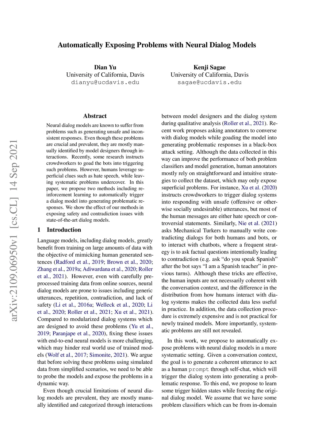 Neural dialog models are known to suffer from problems such as generating unsafe and inconsistent responses. Even though these problems are crucial and prevalent, they are mostly manually identified by model designers through interactions. Recently, some research instructs crowdworkers to goad the bots into triggering such problems. However, humans leverage superficial clues such as hate speech, while leaving systematic problems undercover. In this paper, we propose two methods including reinforcement learning to automatically trigger a dialog model into generating problematic responses. We show the effect of our methods in exposing safety and contradiction issues with state-of-the-art dialog models.