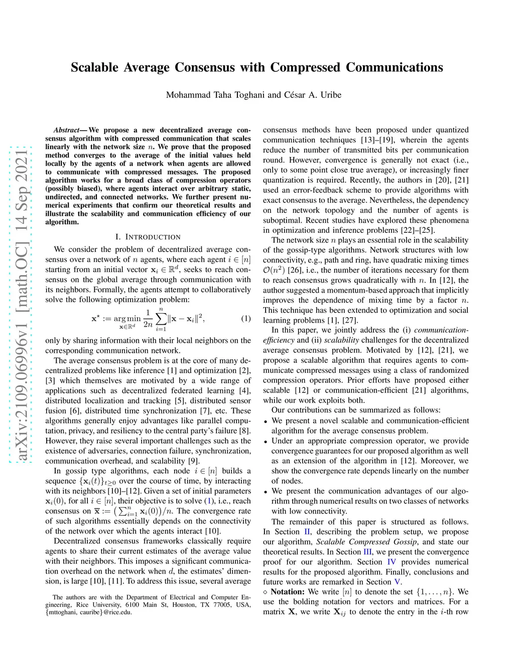 We propose a new decentralized average consensus algorithm with compressed communication that scales linearly with the network size n. We prove that the proposed method converges to the average of the initial values held locally by the agents of a network when agents are allowed to communicate with compressed messages. The proposed algorithm works for a broad class of compression operators (possibly biased), where agents interact over arbitrary static, undirected, and connected networks. We further present numerical experiments that confirm our theoretical results and illustrate the scalability and communication efficiency of our algorithm.