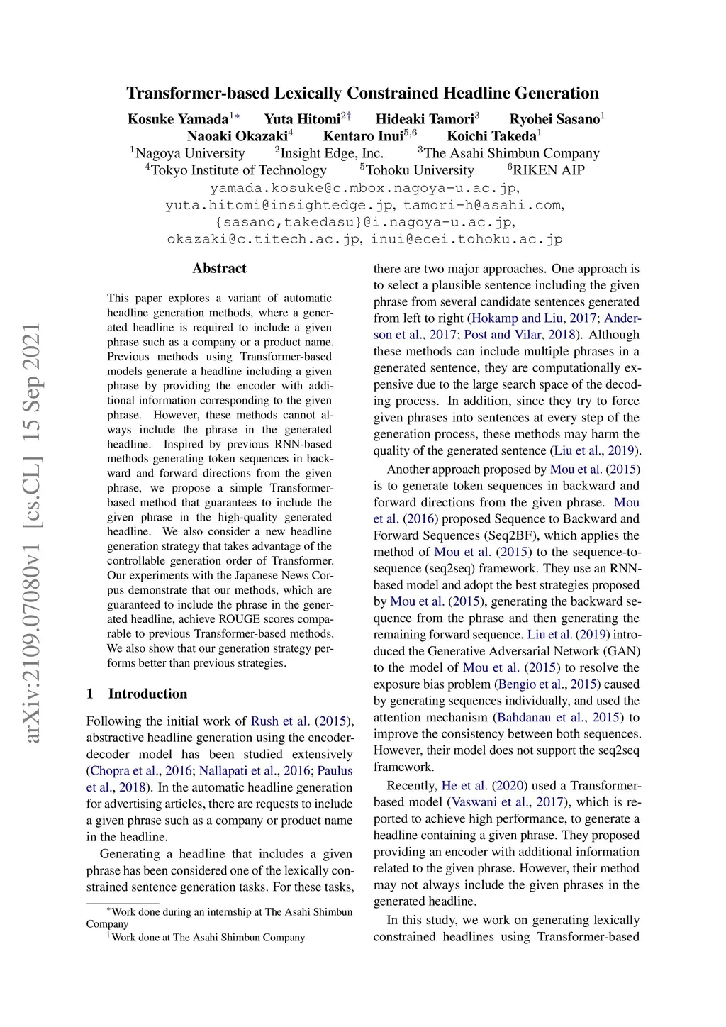 Transformer-based Lexically Constrained Headline Generation