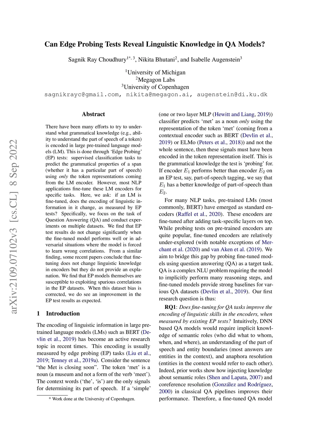 There have been many efforts to try to understand what grammatical knowledge (e.g., ability to understand the part of speech of a token) is encoded in large pre-trained language models (LM). This is done through `Edge Probing' (EP) tests: supervised classification tasks to predict the grammatical properties of a span (whether it has a particular part of speech) using only the token representations coming from the LM encoder. However, most NLP applications fine-tune these LM encoders for specific tasks. Here, we ask: if an LM is fine-tuned, does the encoding of linguistic information in it change, as measured by EP tests? Specifically, we focus on the task of Question Answering (QA) and conduct experiments on multiple datasets. We find that EP test results do not change significantly when the fine-tuned model performs well or in adversarial situations where the model is forced to learn wrong correlations. From a similar finding, some recent papers conclude that fine-tuning does not change linguistic knowledge in encoders but they do not provide an explanation. We find that EP models themselves are susceptible to exploiting spurious correlations in the EP datasets. When this dataset bias is corrected, we do see an improvement in the EP test results as expected.