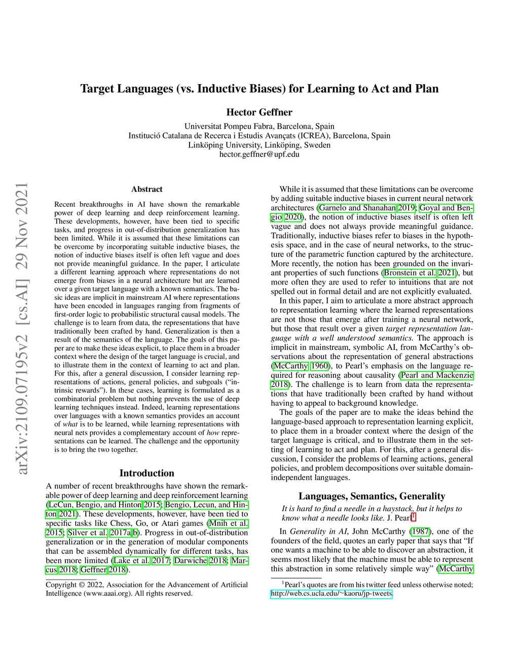 Recent breakthroughs in AI have shown the remarkable power of deep learning and deep reinforcement learning. These developments, however, have been tied to specific tasks, and progress in out-of-distribution generalization has been limited. While it is assumed that these limitations can be overcome by incorporating suitable inductive biases, the notion of inductive biases itself is often left vague and does not provide meaningful guidance. In the paper, I articulate a different learning approach where representations do not emerge from biases in a neural architecture but are learned over a given target language with a known semantics. The basic ideas are implicit in mainstream AI where representations have been encoded in languages ranging from fragments of first-order logic to probabilistic structural causal models. The challenge is to learn from data the representations that have traditionally been crafted by hand. Generalization is then a result of the semantics of the language. The goals of this paper are to make these ideas explicit, to place them in a broader context where the design of the target language is crucial, and to illustrate them in the context of learning to act and plan. For this, after a general discussion, I consider learning representations of actions, general policies, and subgoals ("intrinsic rewards"). In these cases, learning is formulated as a combinatorial problem but nothing prevents the use of deep learning techniques instead. Indeed, learning representations over languages with a known semantics provides an account of what is to be learned, while learning representations with neural nets provides a complementary account of how representations can be learned. The challenge and the opportunity is to bring the two together.