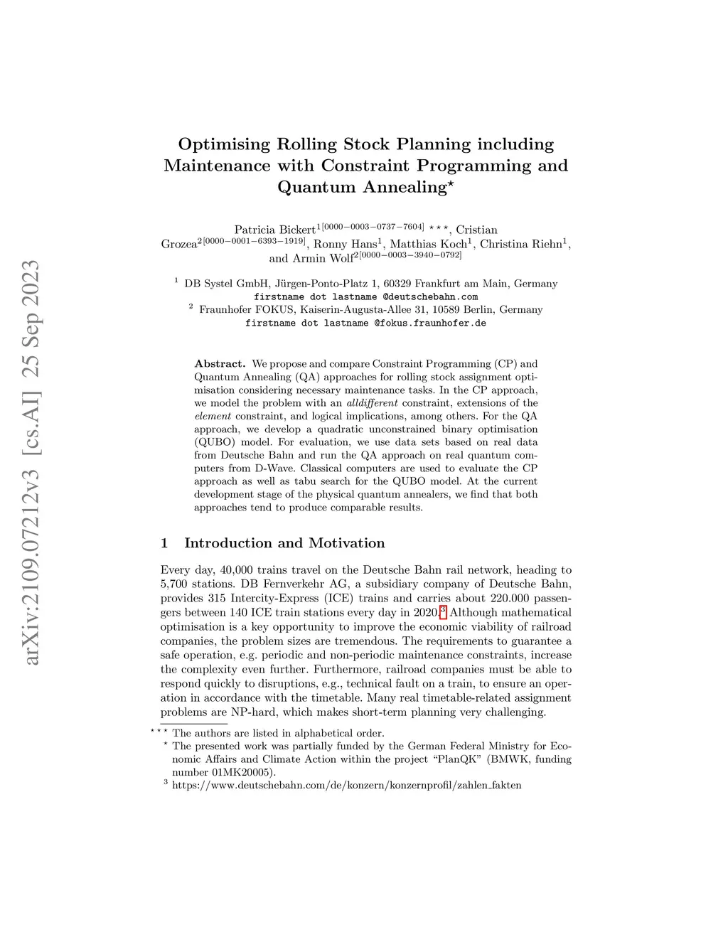 We propose and compare Constraint Programming (CP) and Quantum Annealing (QA) approaches for rolling stock assignment optimisation considering necessary maintenance tasks. In the CP approach, we model the problem with an Alldifferent constraint, extensions of the Element constraint, and logical implications, among others. For the QA approach, we develop a quadratic unconstrained binary optimisation (QUBO) model. For evaluation, we use data sets based on real data from Deutsche Bahn and run the QA approach on real quantum computers from D-Wave. Classical computers are used to evaluate the CP approach as well as tabu search for the QUBO model. At the current development stage of the physical quantum annealers, we find that both approaches tend to produce comparable results.