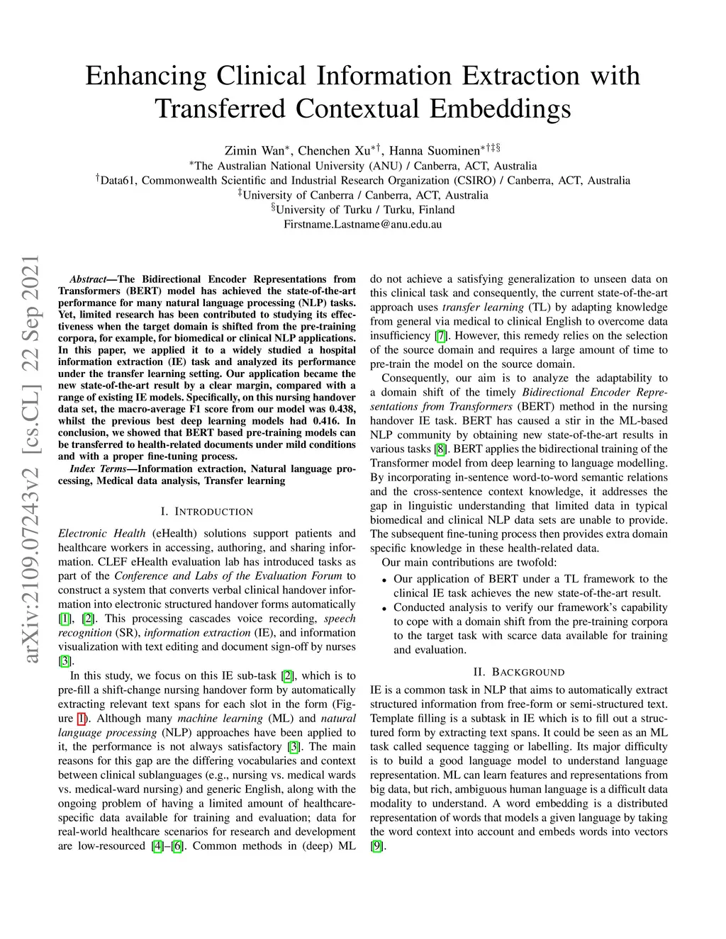 The Bidirectional Encoder Representations from Transformers (BERT) model has achieved the state-of-the-art performance for many natural language processing (NLP) tasks. Yet, limited research has been contributed to studying its effectiveness when the target domain is shifted from the pre-training corpora, for example, for biomedical or clinical NLP applications. In this paper, we applied it to a widely studied a hospital information extraction (IE) task and analyzed its performance under the transfer learning setting. Our application became the new state-of-the-art result by a clear margin, compared with a range of existing IE models. Specifically, on this nursing handover data set, the macro-average F1 score from our model was 0.438, whilst the previous best deep learning models had 0.416. In conclusion, we showed that BERT based pre-training models can be transferred to health-related documents under mild conditions and with a proper fine-tuning process.