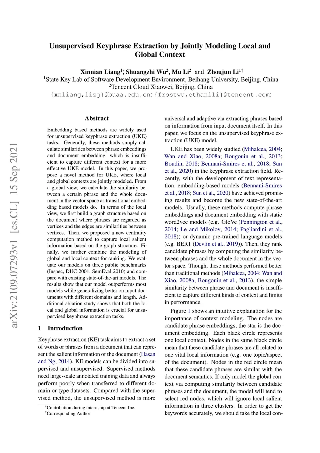 Unsupervised Keyphrase Extraction by Jointly Modeling Local and Global