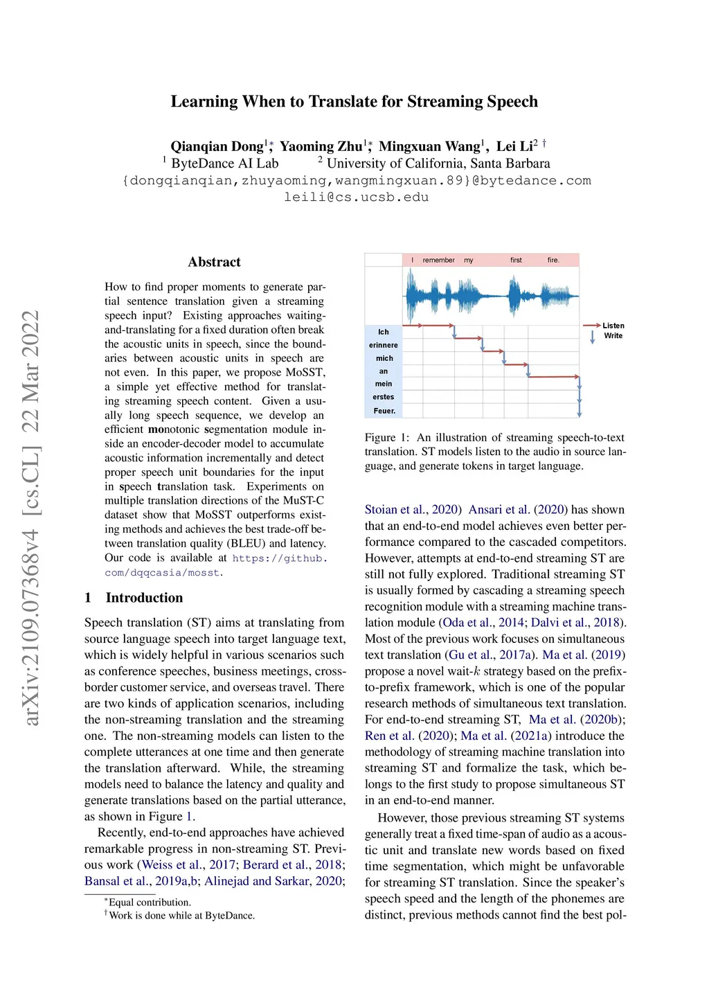 How to find proper moments to generate partial sentence translation given a streaming speech input? Existing approaches waiting-and-translating for a fixed duration often break the acoustic units in speech, since the boundaries between acoustic units in speech are not even. In this paper, we propose MoSST, a simple yet effective method for translating streaming speech content. Given a usually long speech sequence, we develop an efficient monotonic segmentation module inside an encoder-decoder model to accumulate acoustic information incrementally and detect proper speech unit boundaries for the input in speech translation task. Experiments on multiple translation directions of the MuST-C dataset show that MoSST outperforms existing methods and achieves the best trade-off between translation quality (BLEU) and latency. Our code is available at https://github.com/dqqcasia/mosst.