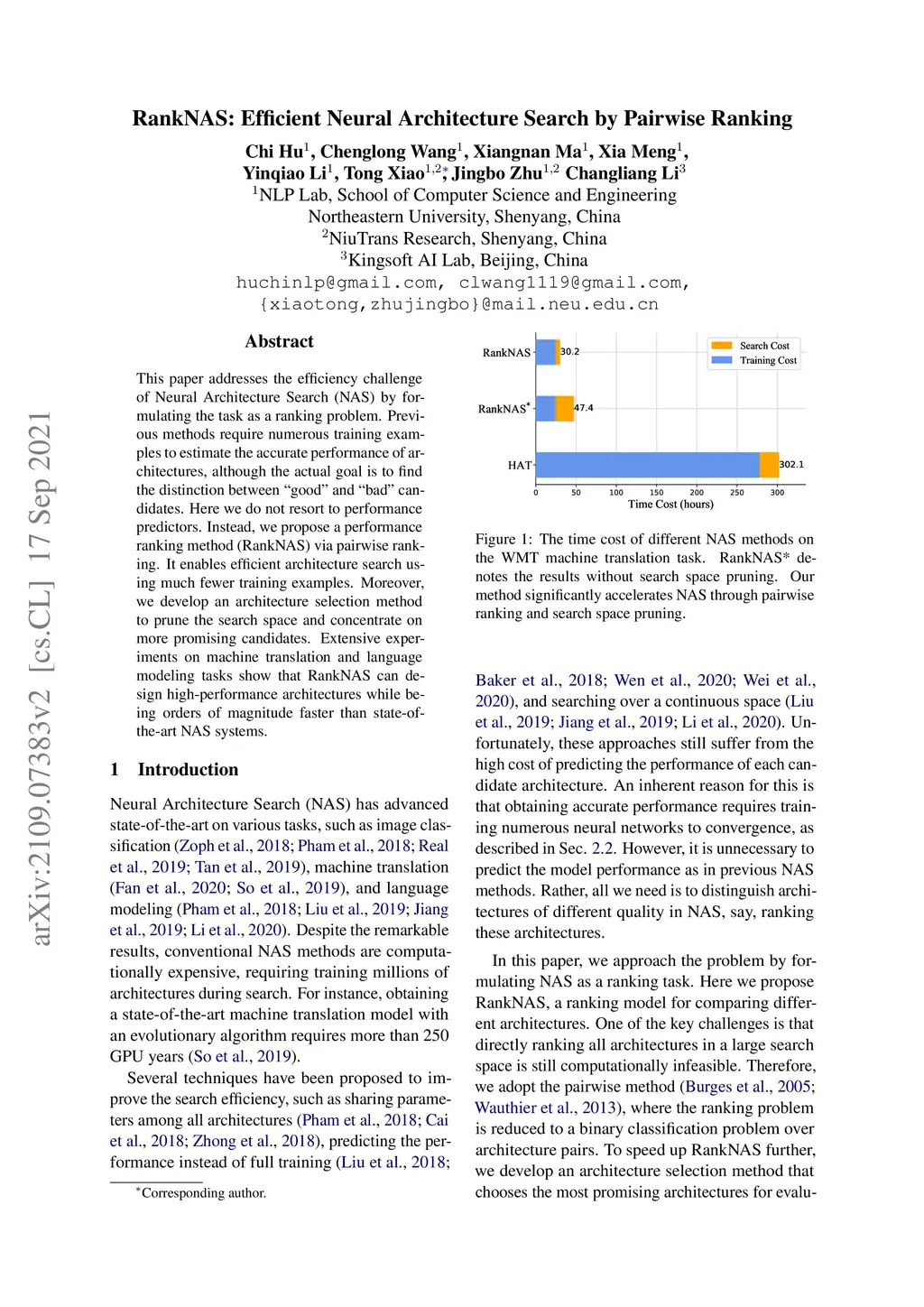 This paper addresses the efficiency challenge of Neural Architecture Search (NAS) by formulating the task as a ranking problem. Previous methods require numerous training examples to estimate the accurate performance of architectures, although the actual goal is to find the distinction between "good" and "bad" candidates. Here we do not resort to performance predictors. Instead, we propose a performance ranking method (RankNAS) via pairwise ranking. It enables efficient architecture search using much fewer training examples. Moreover, we develop an architecture selection method to prune the search space and concentrate on more promising candidates. Extensive experiments on machine translation and language modeling tasks show that RankNAS can design high-performance architectures while being orders of magnitude faster than state-of-the-art NAS systems.
