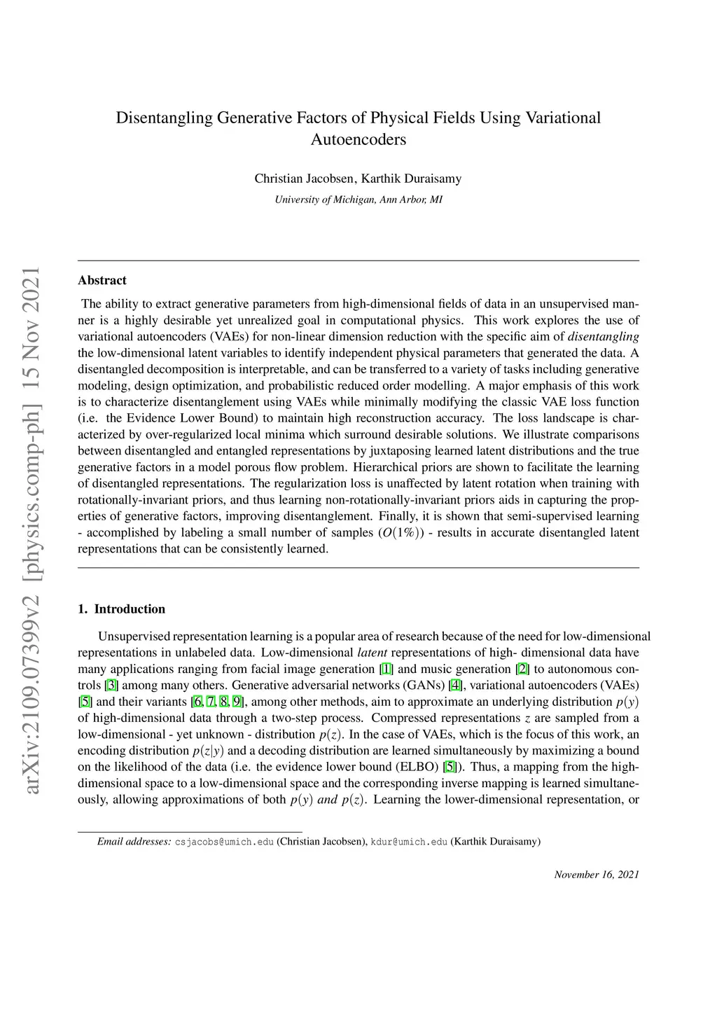 The ability to extract generative parameters from high-dimensional fields of data in an unsupervised manner is a highly desirable yet unrealized goal in computational physics. This work explores the use of variational autoencoders (VAEs) for non-linear dimension reduction with the specific aim of {\em disentangling} the low-dimensional latent variables to identify independent physical parameters that generated the data. A disentangled decomposition is interpretable, and can be transferred to a variety of tasks including generative modeling, design optimization, and probabilistic reduced order modelling. A major emphasis of this work is to characterize disentanglement using VAEs while minimally modifying the classic VAE loss function (i.e. the Evidence Lower Bound) to maintain high reconstruction accuracy. The loss landscape is characterized by over-regularized local minima which surround desirable solutions. We illustrate comparisons between disentangled and entangled representations by juxtaposing learned latent distributions and the true generative factors in a model porous flow problem. Hierarchical priors are shown to facilitate the learning of disentangled representations. The regularization loss is unaffected by latent rotation when training with rotationally-invariant priors, and thus learning non-rotationally-invariant priors aids in capturing the properties of generative factors, improving disentanglement. Finally, it is shown that semi-supervised learning - accomplished by labeling a small number of samples () - results in accurate disentangled latent representations that can be consistently learned.
