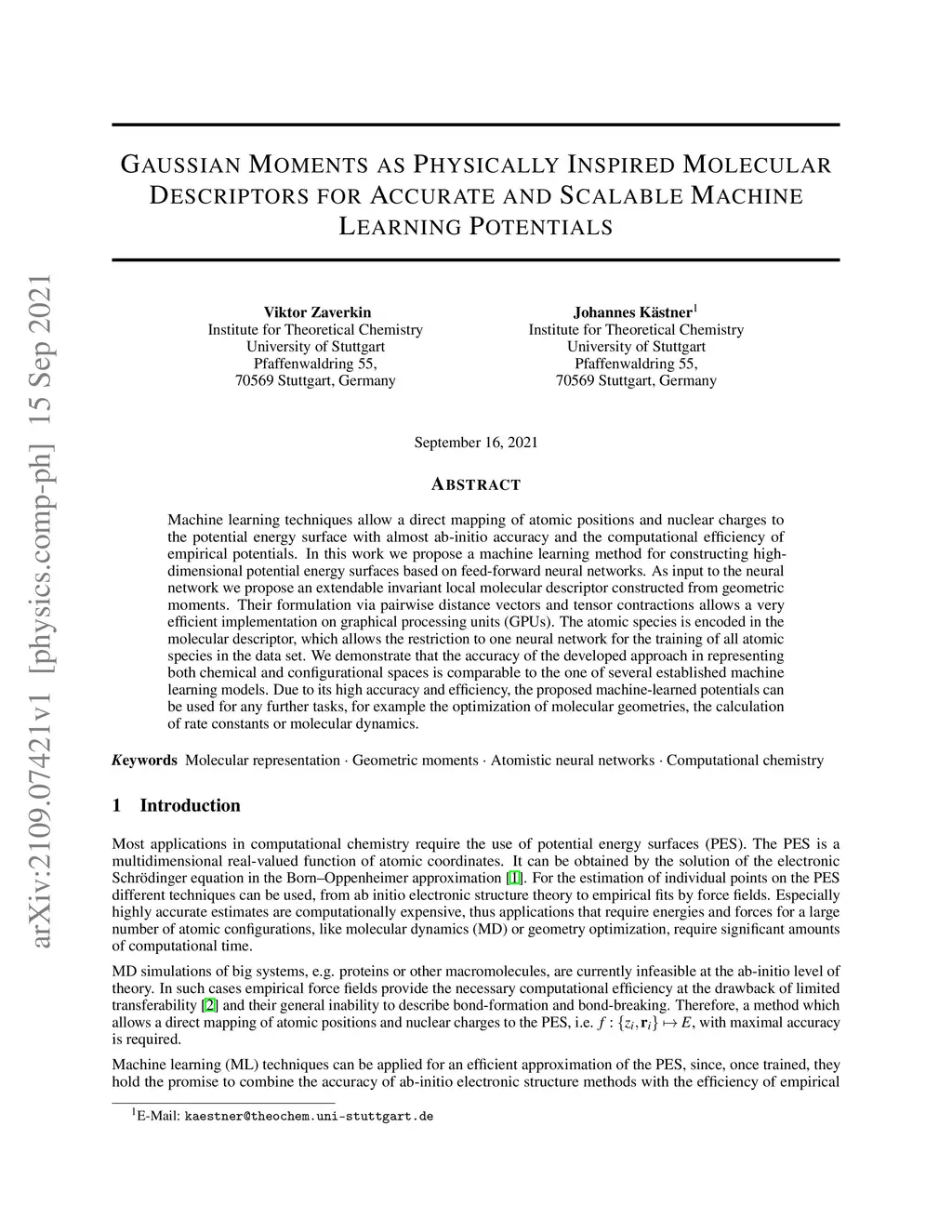 Machine learning techniques allow a direct mapping of atomic positions and nuclear charges to the potential energy surface with almost ab-initio accuracy and the computational efficiency of empirical potentials. In this work we propose a machine learning method for constructing high-dimensional potential energy surfaces based on feed-forward neural networks. As input to the neural network we propose an extendable invariant local molecular descriptor constructed from geometric moments. Their formulation via pairwise distance vectors and tensor contractions allows a very efficient implementation on graphical processing units (GPUs). The atomic species is encoded in the molecular descriptor, which allows the restriction to one neural network for the training of all atomic species in the data set. We demonstrate that the accuracy of the developed approach in representing both chemical and configurational spaces is comparable to the one of several established machine learning models. Due to its high accuracy and efficiency, the proposed machine-learned potentials can be used for any further tasks, for example the optimization of molecular geometries, the calculation of rate constants or molecular dynamics.