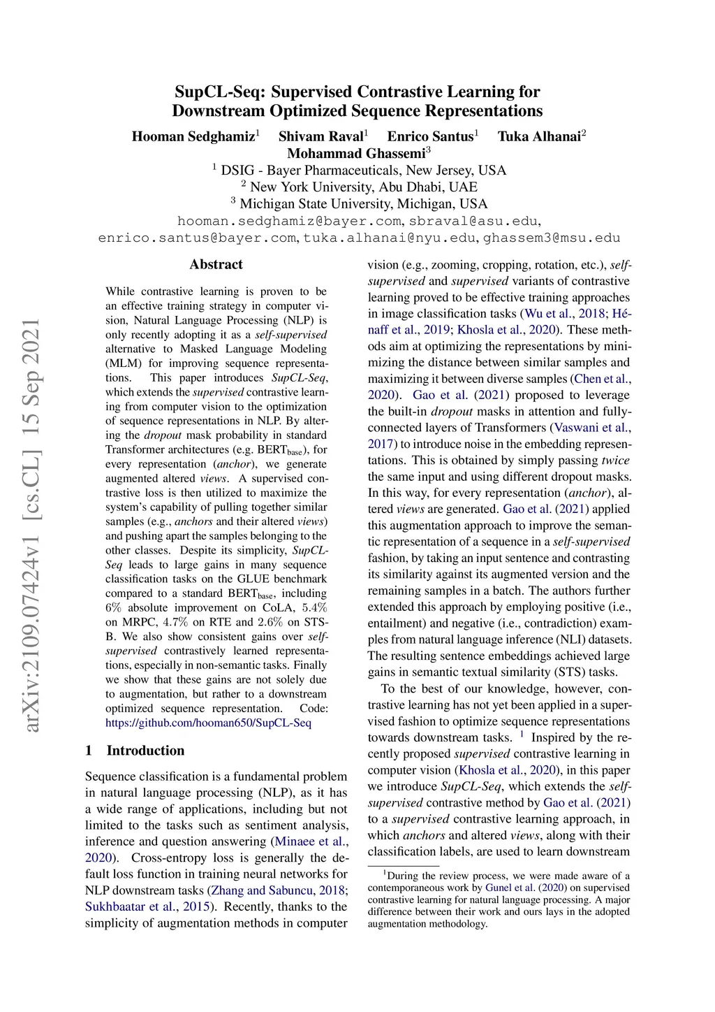 While contrastive learning is proven to be an effective training strategy in computer vision, Natural Language Processing (NLP) is only recently adopting it as a self-supervised alternative to Masked Language Modeling (MLM) for improving sequence representations. This paper introduces SupCL-Seq, which extends the supervised contrastive learning from computer vision to the optimization of sequence representations in NLP. By altering the dropout mask probability in standard Transformer architectures, for every representation (anchor), we generate augmented altered views. A supervised contrastive loss is then utilized to maximize the system's capability of pulling together similar samples (e.g., anchors and their altered views) and pushing apart the samples belonging to the other classes. Despite its simplicity, SupCLSeq leads to large gains in many sequence classification tasks on the GLUE benchmark compared to a standard BERTbase, including 6% absolute improvement on CoLA, 5.4% on MRPC, 4.7% on RTE and 2.6% on STSB. We also show consistent gains over self supervised contrastively learned representations, especially in non-semantic tasks. Finally we show that these gains are not solely due to augmentation, but rather to a downstream optimized sequence representation. Code: https://github.com/hooman650/SupCL-Seq