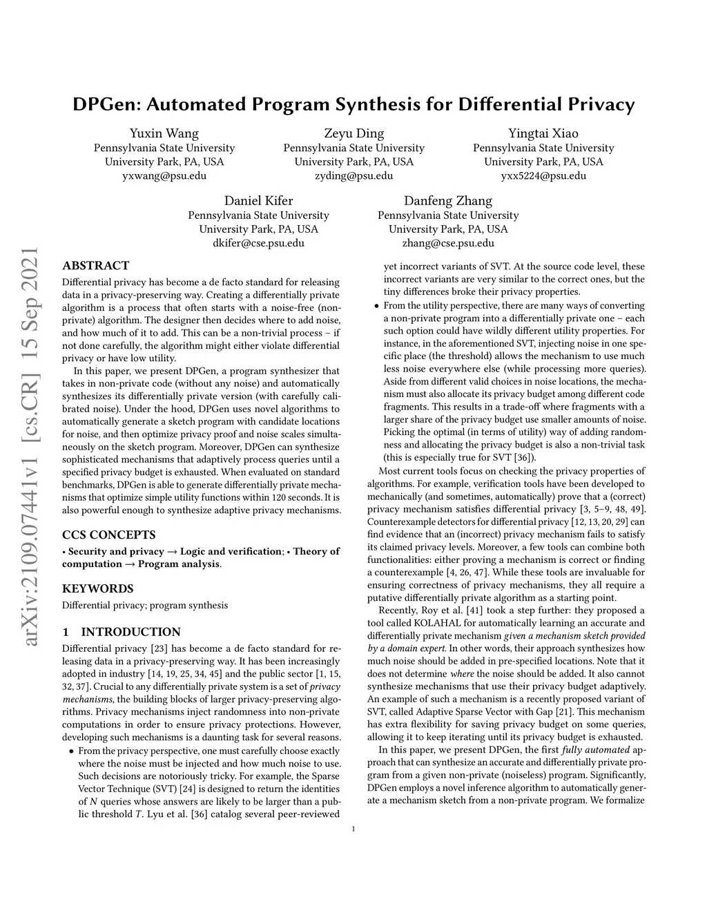 Differential privacy has become a de facto standard for releasing data in a privacy-preserving way. Creating a differentially private algorithm is a process that often starts with a noise-free (non-private) algorithm. The designer then decides where to add noise, and how much of it to add. This can be a non-trivial process -- if not done carefully, the algorithm might either violate differential privacy or have low utility. In this paper, we present DPGen, a program synthesizer that takes in non-private code (without any noise) and automatically synthesizes its differentially private version (with carefully calibrated noise). Under the hood, DPGen uses novel algorithms to automatically generate a sketch program with candidate locations for noise, and then optimize privacy proof and noise scales simultaneously on the sketch program. Moreover, DPGen can synthesize sophisticated mechanisms that adaptively process queries until a specified privacy budget is exhausted. When evaluated on standard benchmarks, DPGen is able to generate differentially private mechanisms that optimize simple utility functions within 120 seconds. It is also powerful enough to synthesize adaptive privacy mechanisms.