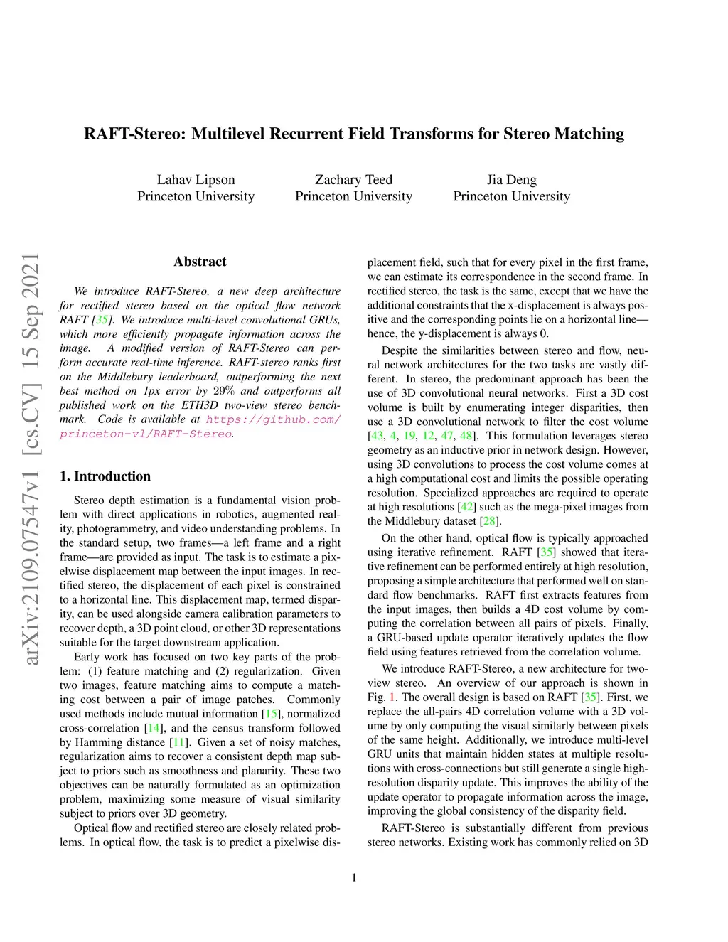 RAFT-Stereo: Multilevel Recurrent Field Transforms for Stereo Matching