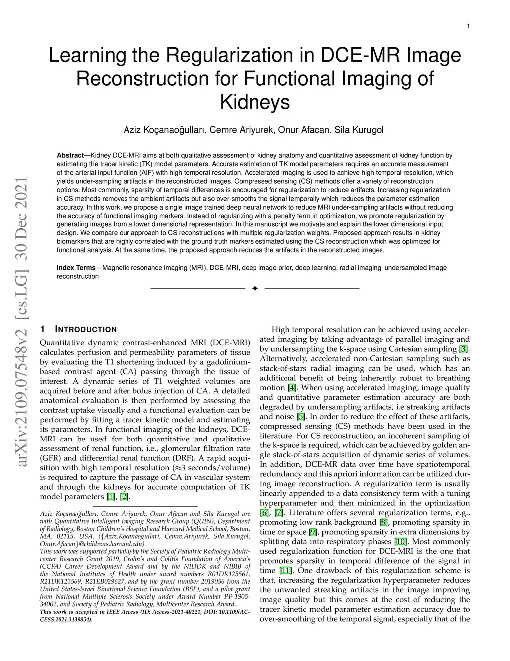 Kidney DCE-MRI aims at both qualitative assessment of kidney anatomy and quantitative assessment of kidney function by estimating the tracer kinetic (TK) model parameters. Accurate estimation of TK model parameters requires an accurate measurement of the arterial input function (AIF) with high temporal resolution. Accelerated imaging is used to achieve high temporal resolution, which yields under-sampling artifacts in the reconstructed images. Compressed sensing (CS) methods offer a variety of reconstruction options. Most commonly, sparsity of temporal differences is encouraged for regularization to reduce artifacts. Increasing regularization in CS methods removes the ambient artifacts but also over-smooths the signal temporally which reduces the parameter estimation accuracy. In this work, we propose a single image trained deep neural network to reduce MRI under-sampling artifacts without reducing the accuracy of functional imaging markers. Instead of regularizing with a penalty term in optimization, we promote regularization by generating images from a lower dimensional representation. In this manuscript we motivate and explain the lower dimensional input design. We compare our approach to CS reconstructions with multiple regularization weights. Proposed approach results in kidney biomarkers that are highly correlated with the ground truth markers estimated using the CS reconstruction which was optimized for functional analysis. At the same time, the proposed approach reduces the artifacts in the reconstructed images.