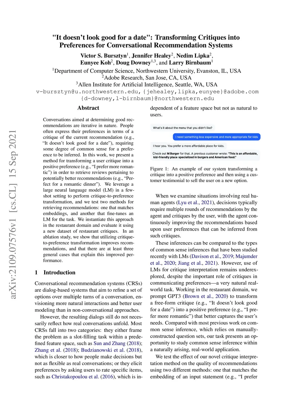 Conversations aimed at determining good recommendations are iterative in nature. People often express their preferences in terms of a critique of the current recommendation (e.g., "It doesn't look good for a date"), requiring some degree of common sense for a preference to be inferred. In this work, we present a method for transforming a user critique into a positive preference (e.g., "I prefer more romantic") in order to retrieve reviews pertaining to potentially better recommendations (e.g., "Perfect for a romantic dinner"). We leverage a large neural language model (LM) in a few-shot setting to perform critique-to-preference transformation, and we test two methods for retrieving recommendations: one that matches embeddings, and another that fine-tunes an LM for the task. We instantiate this approach in the restaurant domain and evaluate it using a new dataset of restaurant critiques. In an ablation study, we show that utilizing critique-to-preference transformation improves recommendations, and that there are at least three general cases that explain this improved performance.