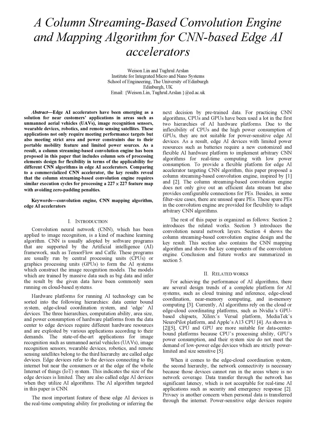 Edge AI accelerators have been emerging as a solution for near customers' applications in areas such as unmanned aerial vehicles (UAVs), image recognition sensors, wearable devices, robotics, and remote sensing satellites. These applications not only require meeting performance targets but also meeting strict area and power constraints due to their portable mobility feature and limited power sources. As a result, a column streaming-based convolution engine has been proposed in this paper that includes column sets of processing elements design for flexibility in terms of the applicability for different CNN algorithms in edge AI accelerators. Comparing to a commercialized CNN accelerator, the key results reveal that the column streaming-based convolution engine requires similar execution cycles for processing a 227 x 227 feature map with avoiding zero-padding penalties.